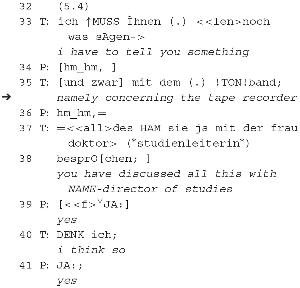 In summary, in this sequence, the therapist places an announcement (“I have to tell you something”, 33) in order to prepare the reference to the recorder (35) that is secured via a polar question (37–38) and finally confirmed by the patient. The patient aligns with the communicative project (Clark, 1996) of the therapist by answering the polar question in a progressive way and thereby confirming the initiating announcement of the therapist. The preannouncement of the therapist conveys that he will now be addressing a delicate subject. Not only delicate to the patient but probably delicate to himself.