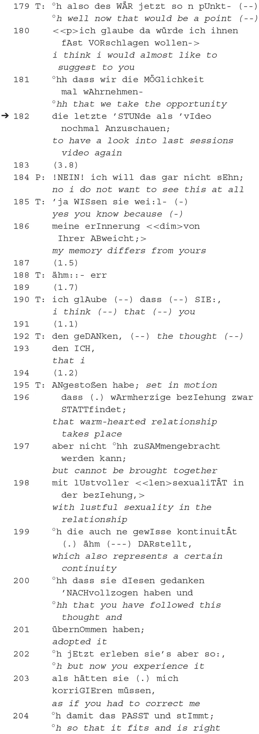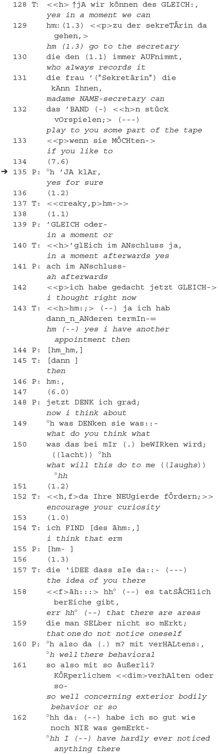 The therapist complies with this request to speak only after a long pause and initiates a repair of the patient. Interestingly, the repair is initiated by means of an orientation to being recorded located in the local environment, which, however, is not “determined” as noticing, i.e., made identifiable (e.g., by certain articles, description of the place, or actually pointing to it). The misunderstanding (Hinnenkamp, 1998) is already indicated by the long pause (187) after the patient's request for understanding. It is cleared up by the patient, who refers to a fantasized situation: “without you—just a tape recorder” (190). In this case, and unlike in excerpt 1.2, the therapist does not enable the subsequent actions of self-exploration by a direct request. The therapist, like in extract 2, responds to the patient's request to speak, thereby initiating the patient's work on redressing the epistemic balance. The patient elaborates that she is “afraid” (199) that “things […] will come out that I have repressed” (201–202). With the help of the mental experiment (only recording device, no resonant therapist), she addresses the problem previously mentioned by the therapist, according to which he is not only a receiver (165) but someone listening.