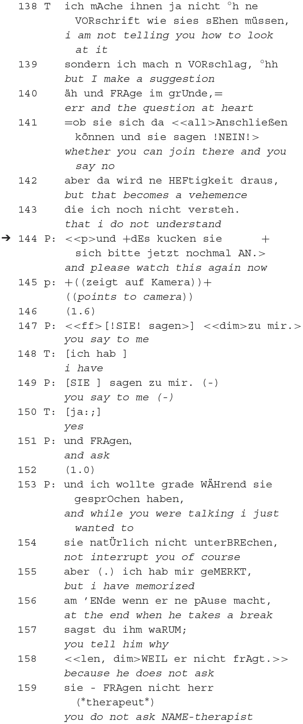 After the indirect rejection of the therapist's request, the patient places an argumentative reference (Sacks, 1995 [1992])—by pointing to the video recorder and asking him to watch the recording (144). Subsequently, the patient explicates that he has signaled to the therapist's listenership in order not to interrupt him (155), nurturing the plan to formulate a reproach. He accuses the therapist of telling the patient something instead of asking (159). Only after the patient's orientation to being recorded (144–145), the interactional history is rearranged (153) from a claim of listening into a reproach (159).