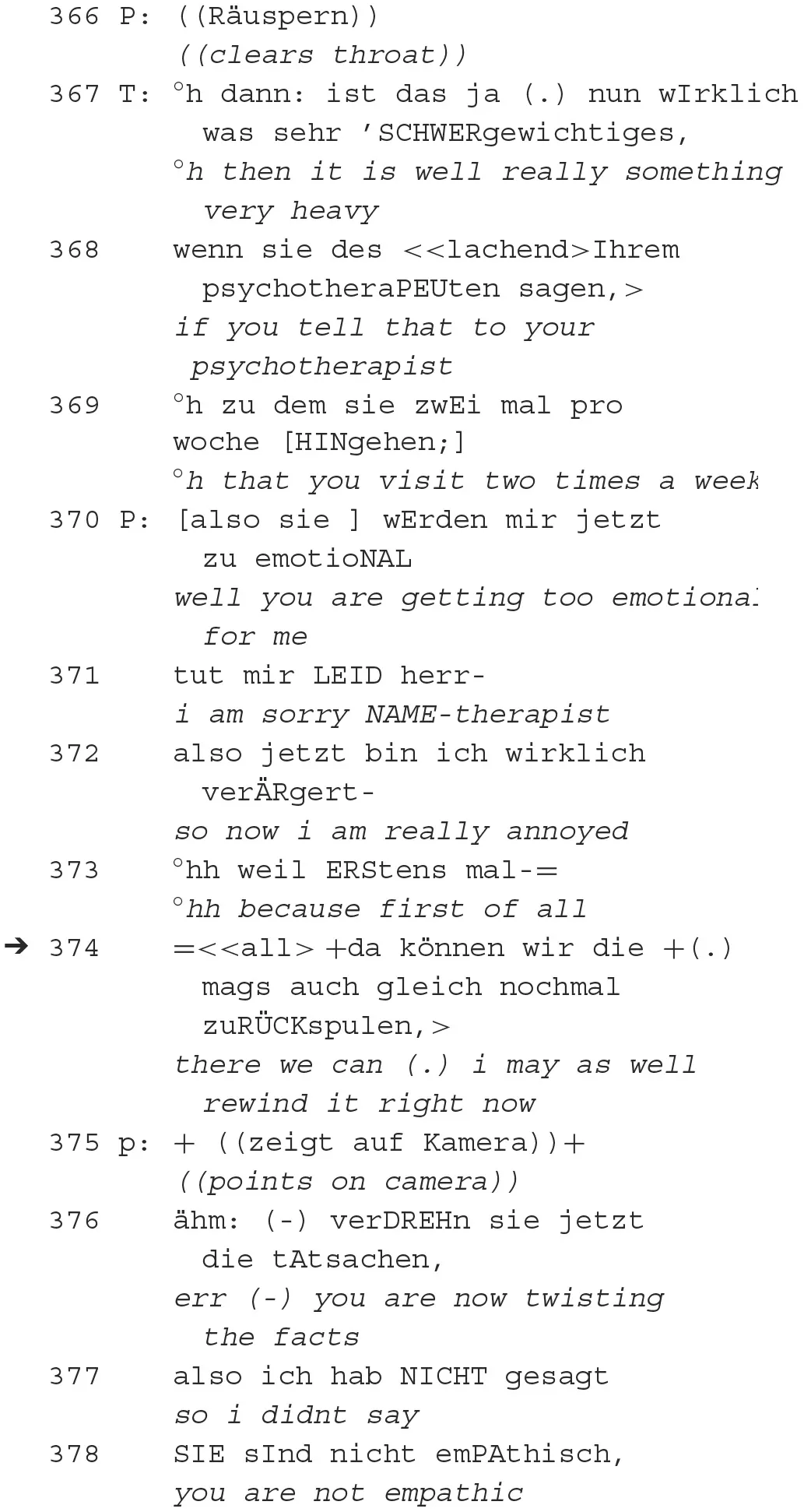 After this intensification of the conflict, the patient interprets the therapist (as “too emotional”, 370), places an ironic preface (371) and then leads over to his emotional mood (“annoyed”, 372) before using the recording device as a resource for the placement of a reproach (376) by means of argumentative reference.