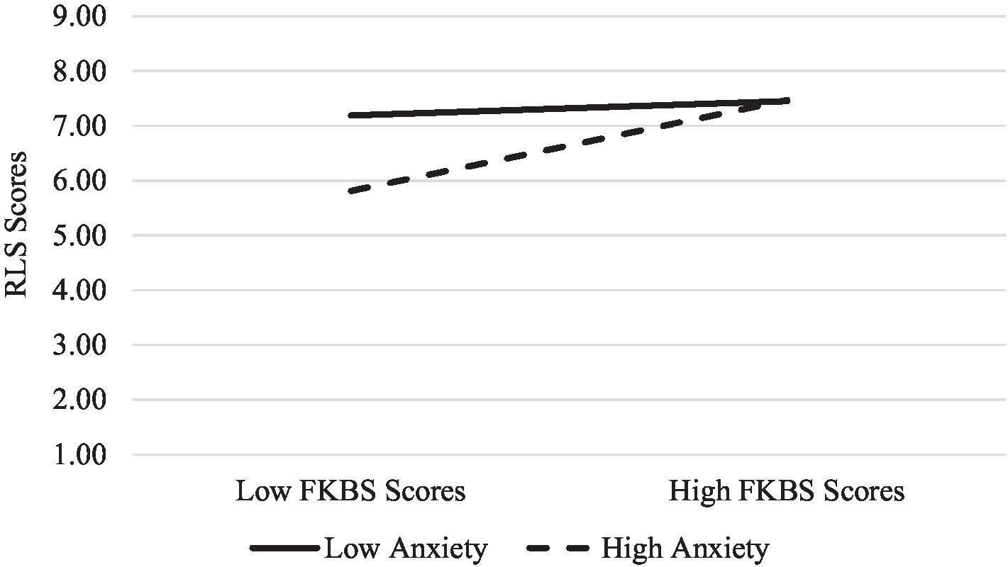 To ensure sufficient power to conduct the exploratory moderation model, a sensitivity analysis was conducted for Study Two. The results revealed that the moderation analysis was sufficiently powered (80%) to detect a small-to-medium effect (f2 = 0.04; F = 2.64) with a p value of = 0.05. Approximately 0.9% of data was missing at the participant level, thus missing values were dealt with using listwise deletion. Although there was only one outlier on the Anxiety subscale of the ECR Scale, the Avoidance subscale of the ECR Scale, and the FKBS, all outlier values were reported by the same participant. Thus, this individual was removed from all analyses, resulting in a final sample size of 234 participants. After reviewing the distributions for the variables of interest, the RLS and the Anxious subscale of the ECR Scale demonstrated significant skew. That said, the skew was resolved for both scales using a logarithmic transformation. Once again, all descriptive statistics are reported below in raw values.