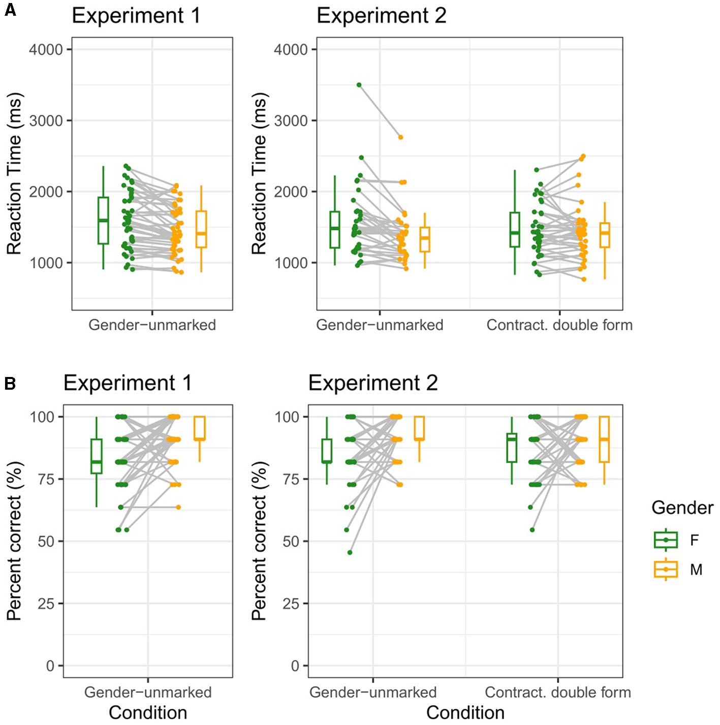 The structure of the models in experiment 2 replicated that employed in experiment 1, with the only difference that the models also include the effect of factor condition (0: gender-unmarked; 1: contracted double) and a two-way interaction between this factor and grammatical gender (0: female; 1: male).