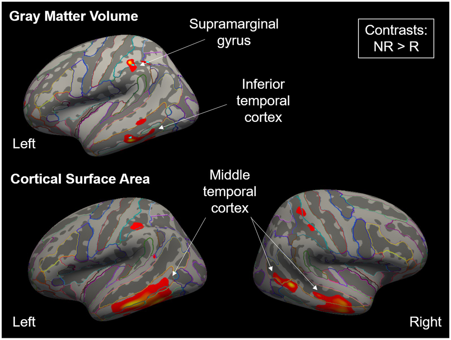 To examine structural differences between placebo responders and non-responders, we computed a whole-brain analysis for both hemispheres and each outcome measure - GMV, CSA and CT. First, all individual reconstructed cortical surfaces were aligned to an average template using the mri_preproc function in FreeSurfer. Then, intergroup comparisons were performed using vertex-by-vertex general linear models by applying the mri_glmfit function, separate for each hemisphere and measure. Cluster-wise correction for multiple comparisons was performed for all results using pre-computed z Monte Carlo simulations within the function mri_glmfit-sim, which we used to calculate cluster-corrected maps for each contrast. A cluster-wise threshold of p < 0.05 was used and the vertex-wise criterion for statistical significance was set at p < 0.001 (two-sided test). Results are reported using the contrasts responders vs. non-responders and vice versa.