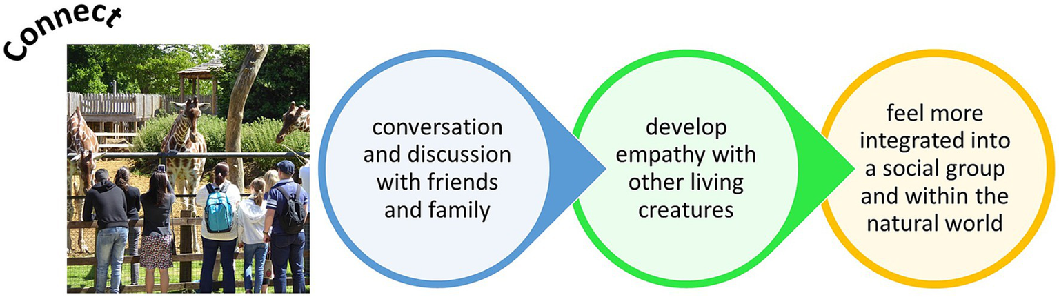 Zoos provide spaces that enable people to connect; both with each other and with the natural environment. A key element of the Five Ways to Wellbeing is the building and maintenance of positive relationships with others as a crucial element for long-term well-being. In the zoo, connecting with family, friends, colleagues, and the wider community is possible and can provide feelings of belonging, support, and purpose. Zoo visits foster a sense of interest in nature, facilitate social support, and spark positive discussion on the animals that visitors interact with Clayton et al. (2009) and Clayton et al. (2014). As being connected fosters an individual’s sense of value and enhances social interactions (Martino et al., 2017), positive impacts on mental health and physical health become realized. Across the world, there are estimates that over 700 million people may visit a zoo annually (Gusset and Dick, 2011). By connecting individuals together as well as connecting people with nature, zoos can positively impact human health, and spread positive human Behavior change messages more widely that can ultimately benefit planetary health too (Falk et al., 2007; Jensen et al., 2017; Godinez and Fernandez, 2019).