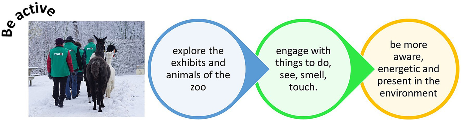 Participation in guided tours with other visitors could develop new social bonds and a sense of connection with other likeminded individuals that have similar interests and passions. These events involve activity (walking around the zoo itself) but also could encourage activity away from the zoo, and opportunities to explore other green or blue spaces that the visitor learns about during the visit. For example, zoos may manage a nature reserve at a separate location; if these nature reserves are highlighted to participants on a tour, a new venue for physical activity is made available for people to potentially engage with. Guided tours increase participants knowledge and education on a specific topic (Whitehouse-Tedd et al., 2022) and as such, could be used to present other opportunities for activity that leads to increased connection with nature both at and away from the zoo. Such guided tours may be particularly important for people who visit a zoo alone to give a chance to strike up conversation with others around them and to therefore broaden their own social environment. Zoos provide multiple topics of conservation and moving between enclosures provides a variety of sensory experiences that can be discussed, explained, and explored. Opportunities for this activity could themed for a specific audience to encourage uptake on a tailored activity with key aims for that demographic.