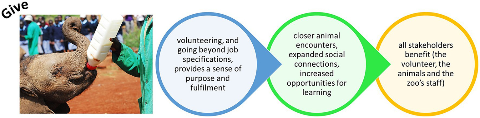 For those immersed in these environments as their place of work, there are connection benefits too, particularly for animal care staff. Their roles require undertaking physically demanding work yet their willingness to “give back” beyond their job description resonates as they see the value in their efforts to animal welfare and conservation outcomes. Compassion fatigue is a genuine risk to animal care staff (Figley and Roop, 2006) as the toll of seeing animals failing to thrive can manifest into acquiescence. The relevance of good animal welfare here is paramount – seeing animals thrive brings a sense of proud fulfillment and pride in one’s job. This enhances happiness and creates opportunities to connect with other staff to share successes and good practice, and consequential scope for mindful happiness. Zoos should value their staff and sufficiently support their needs, both personal and professional, while prioritizing animal welfare to evidence the Five Ways to Wellbeing in their extensive workforce.