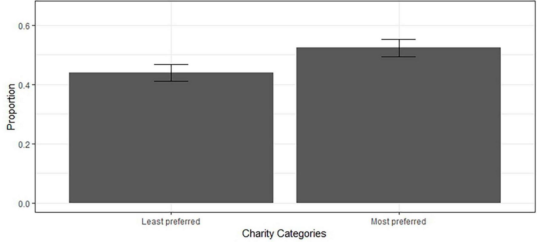 Based on this theoretical background, the first research question is to what extent does information transparency influence donation decisions directed to different charitable categories (RQ1). With reference to the self-signaling model, we hypothesize that participants are less likely to choose the prosocial option in the incomplete information condition as compared to the complete information condition (H1a). Additionally, considering that individuals have personal preferences for different charitable categories, some of these recipients would be situated closer to the self in the participants’ moral circle than others. We hypothesize that participants will choose the prosocial option more for the most preferred charitable category than the least preferred charitable category (H1b).