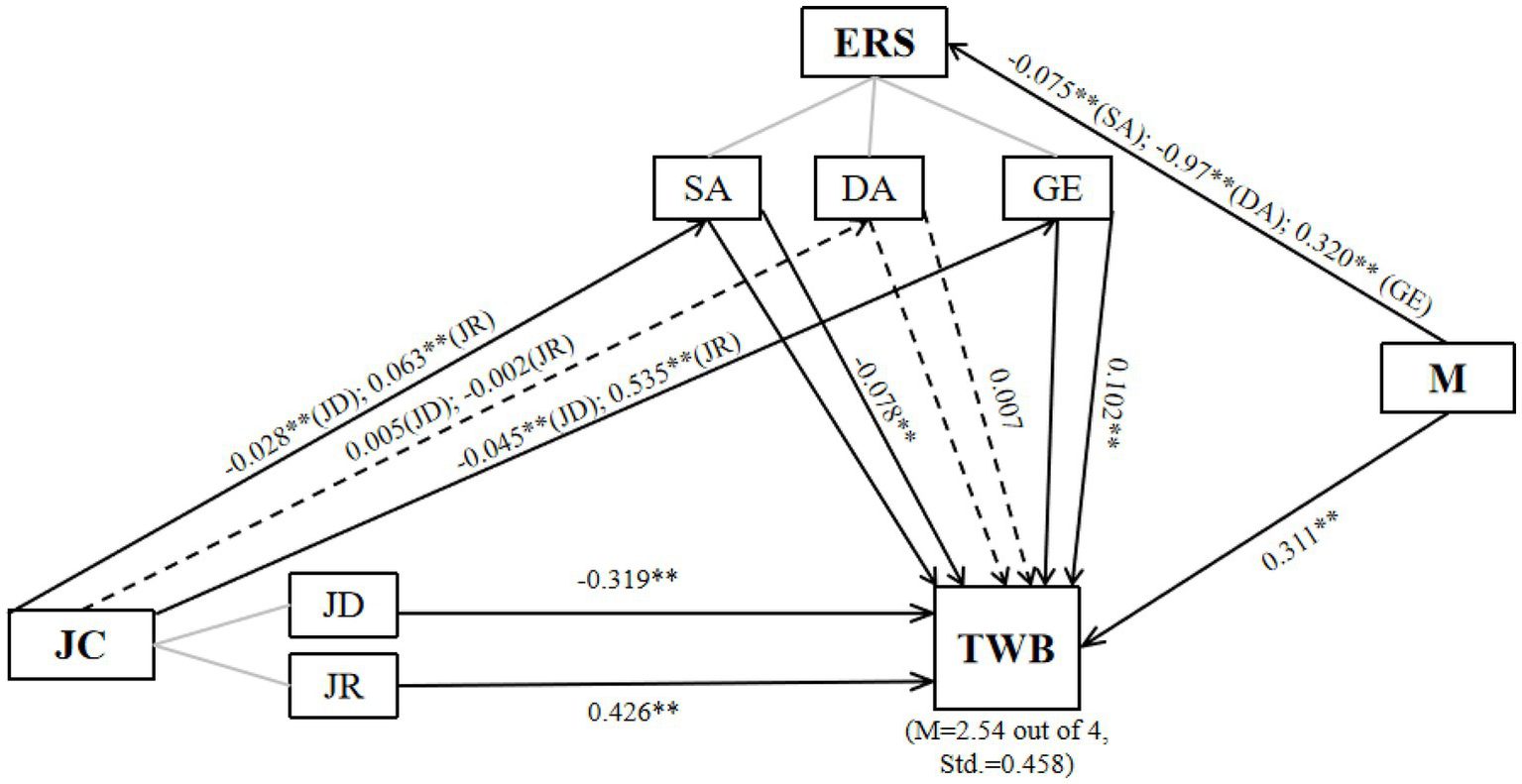 Mediation model of teacher wellbeing. TWB, teacher wellbeing; JC, job characteristics; JD, job demands; JR, job resources; ERS, emotional regulation strategies; SA, surface acting; DA, deep acting; GE, genuinely expressing; M, mindset. (**p < 0.05; solid lines, significant; dotted lines, not significant).