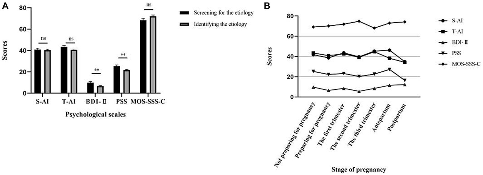 Psychological changes in different stages in RPL women. (A). Anxiety (S-AI/T-AI), depression (BDI-II), stress (PSS), and social support (MOS-SSS-C) scores of RPL women at different stages of diagnosis and treatment. (B). Anxiety (S-AI/T-AI), depression (BDI-II), stress (PSS), and social support (MOS-SSS-C) scores of RPL women at different stages of pregnancy. S-AI, state anxiety; T-AI, trait anxiety; BDI-II, Beck depression Inventory-II; PSS, perceived stress scale; MOS-SSS-C, medical outcomes study social support survey.