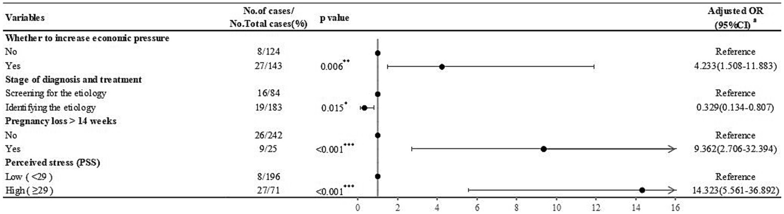 From March to June 2021, we conducted an electronic questionnaire survey of 267 RPL women who attended the recurrent pregnancy loss clinic at Shengjing Hospital of China Medical University. The State–Trait Anxiety Inventory (STAI), Beck Depression Inventory-II (BDI-II), Perceived Stress Scale (PSS), and Medical Outcomes Study Social Support Survey (MOS-SSS-C) were used to screen for anxiety, depression, stress, and social support. Logistic regression was used to explore the related factors of anxiety and depression.