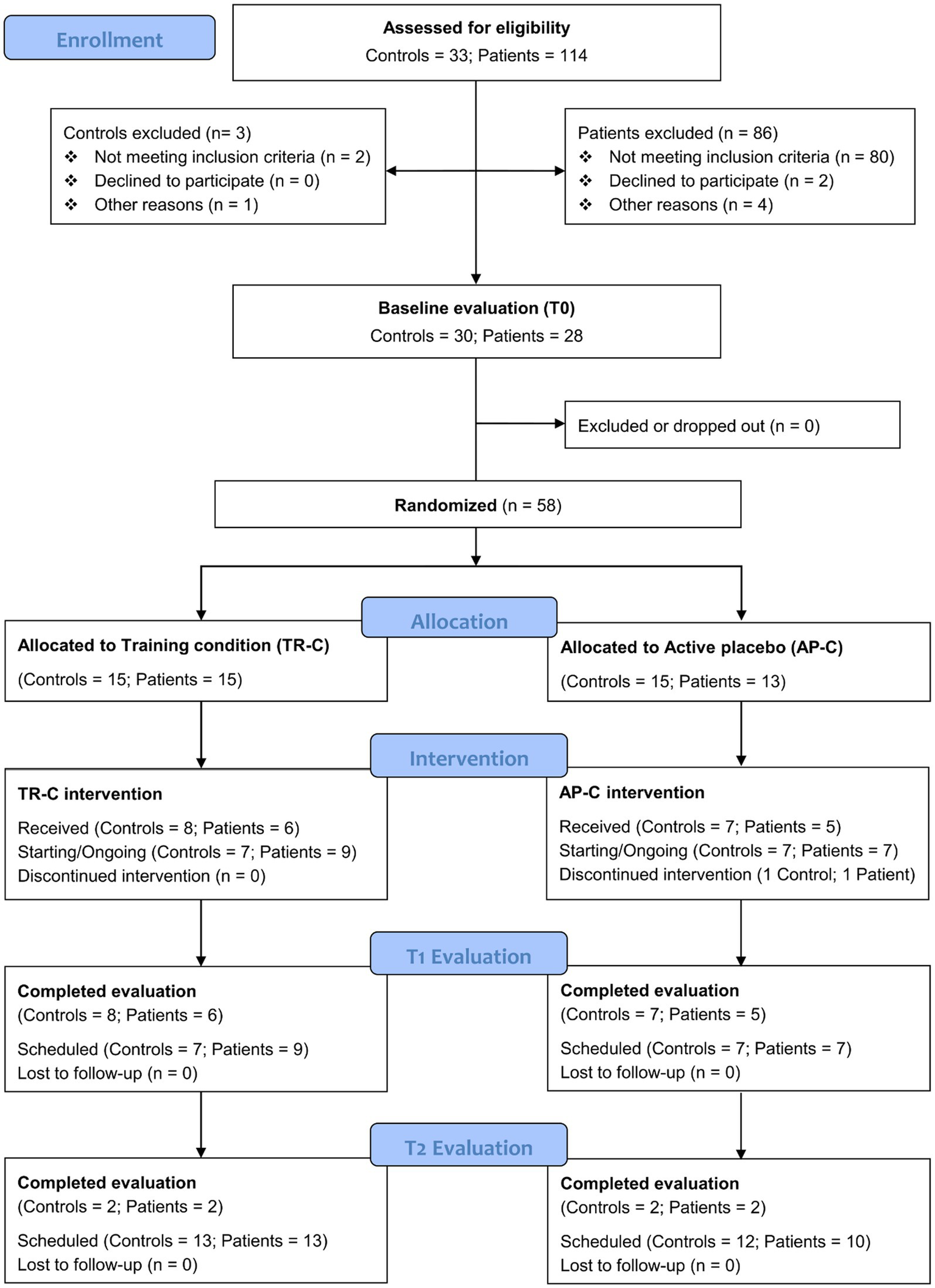 As reported in Figure 1, to date a total of n = 114 patients with idiopathic PD and n = 33 potential controls have been screened for eligibility. After this stage, n = 86 patients and n = 3 controls were excluded because they did not meet the inclusion criteria or declined to participate, while the remaining n = 58 participants (n = 28 PD-MCI patients and n = 30 HC subjects) resulted eligible and were thus submitted to the baseline outcome evaluation (T0). Then, they were randomly assigned to one of the experimental conditions (i.e., TR-C or AP-C). Specifically, 15 PD-MCI and 15 HC were assigned to the TR-C, while 13 PD-MCI and 15 HC were assigned to the AP-C.