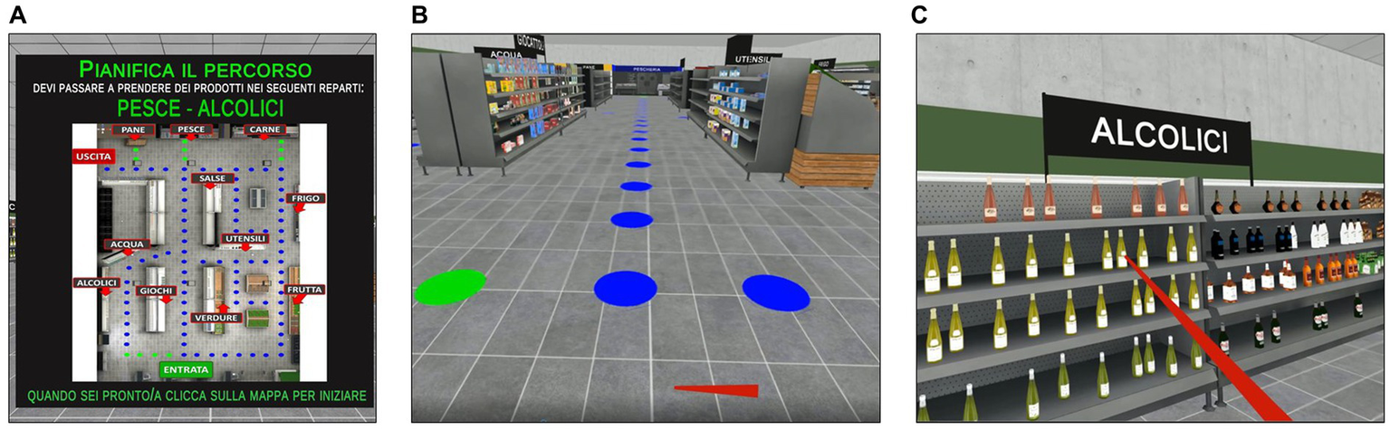 The planning task was developed as an ecological, IVR-adapted version of the paper-pencil Zoo map test (Wilson et al., 1998). It is composed of two main scenes. Specifically, on the initial screen, participants are presented with the map of a supermarket (Figure 2A) and asked to plan a route that allows them to pick a series of target products from the indicated sections (e.g., “You have to pick 2 products, one from the fruit section and one from the butcher section”) while following certain rules. These rules include: starting at the entrance and ending at the exit, using the blue paths of the supermarket only once and the green paths as many times as needed. The task has been constructed in such a way that visiting the designated locations in the order in which they are given in the instructions can lead to errors; in this way, the initiative and the planning capacity of the participant are tested. In this phase, no time restriction is given for planning. After planning the route, and thus the order in which the indicated locations would be visited, the scenario changes and the participants are immersed inside the supermarket (Figure 2B). They can navigate through the aisles (which contain shelf units filled with grocery items) by using the HMD controller. Specifically, they have to place the ray-cast on the closest blue or green dot (depending on the path) on the floor and click the trigger button to move forward. At this point, the participants are asked to walk the route that they have previously planned. When approaching a designated location, they are asked to pick one product from the shelf. To pick an item, patients have to use the Oculus controller (i.e., by colliding the ray-cast with the product and clicking the trigger button to pick it) (Figure 2C). An acoustic signal indicates that the product has been correctly taken. At any time during the task the participants can see the map (in which their current position inside the supermarket is highlighted), and the rules and the products to pick by clicking on the Touch Pad button of their Oculus controller.