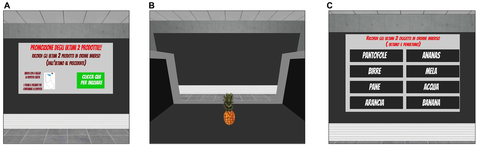 This task was developed as an ecological and IVR-implemented version of traditional working memory tests. The scenario consists of a supermarket checkout, where participants are shown a series of goods and tools moving on a conveyor belt (one at a time, each shown for 4 s) (Figure 4B). The number of items included in each series randomly varies among trials and according to the level of difficulty. Participants are asked to name each item as it passes on the conveyor belt (i.e., to ensure that they are attending to the items) and to memorise the last n items of the series in reverse order (i.e., the last item, the next to last item, etc.). The number of items to be remembered in reverse order is specified on the initial screen of each trial, together with the general instructions for carrying out the task (Figure 4A). After completing the serial presentation of products, a virtual table appears in the scene in front of the participants that shows a list of possible items among which they have to identify the last n products of the previously presented series in reverse order. In this way, they are instructed to select from the alternatives the last product of the series as first, then the second to last item, and so on based on how many items they have to remember (Figure 4C). To make their selection, participants have to collide the ray-cast with their chosen alternatives and to click the trigger button to confirm. An acoustic signal indicates that the selection has been correctly acquired by the system. Since the number of items in each series is not fixed, but varies randomly among trials and levels of difficulty, here the ability to continuously update, maintain and manipulate information in working memory is particularly required to perform the task correctly.