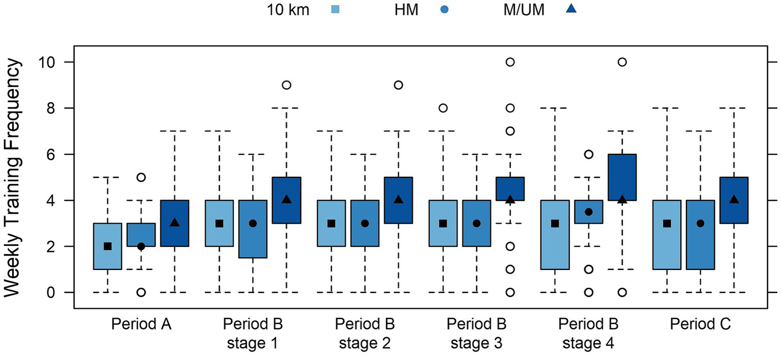Figure 2. Box plots of interactions between race distance subgroups and weekly training sessions within training periods displayed by median (quartile range) including period B conditions.
