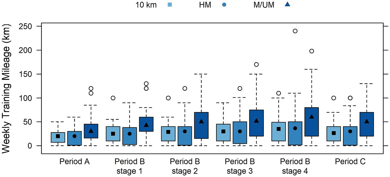 Figure 3. Box plots of interactions between race distance subgroups and weekly training kilometers within training periods displayed by median (quartile range) including period B conditions.