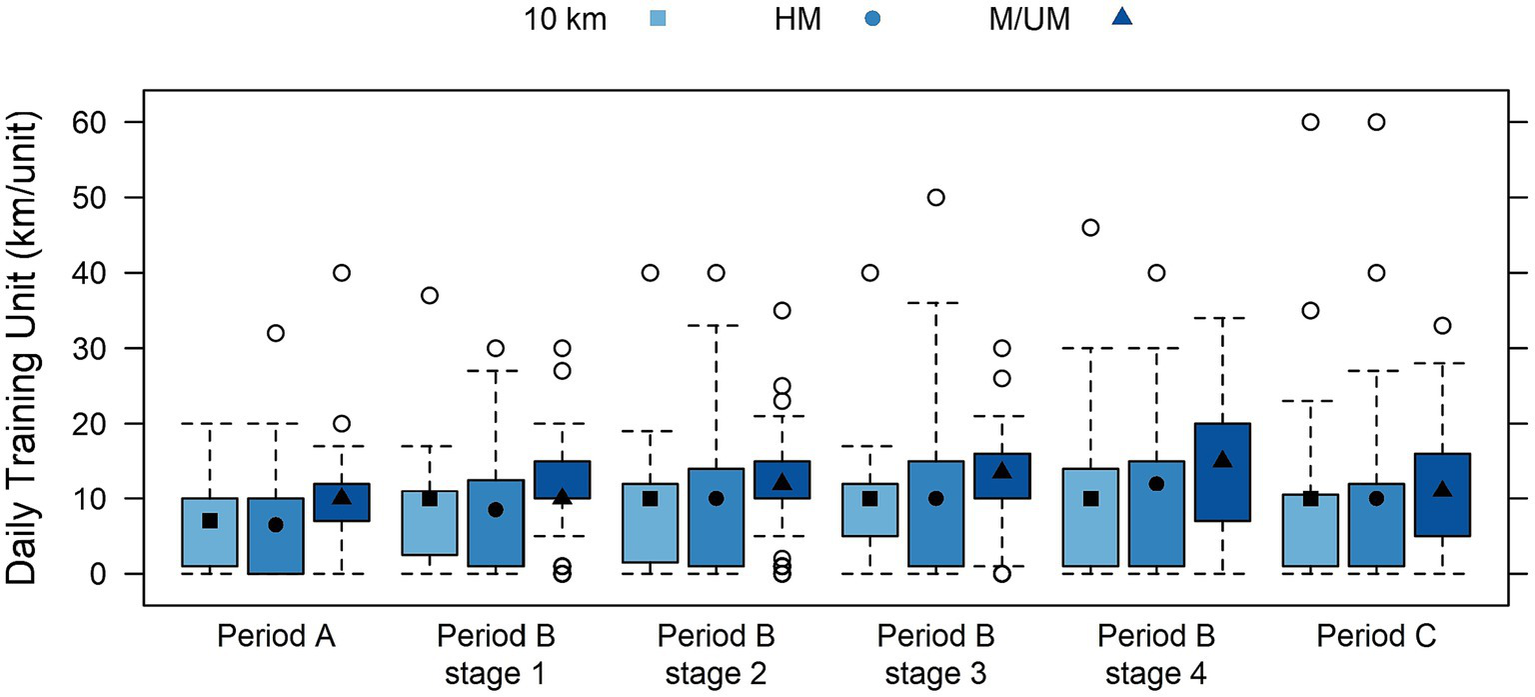 Figure 4. Box plots of interactions between race distance subgroups and daily training kilometers within training periods displaying median (quartile range) including period B conditions.