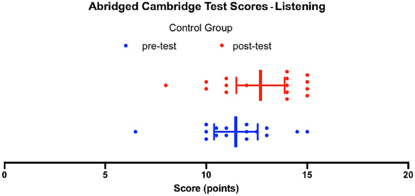 Figure 2 presents the scores achieved by the control group on the listening pre-test and listening post-test adapted from the B2 First proficiency exam (Cambridge Assessment English, 2015). On the pre-test, the median score is 11.5, and the interquartile range of 2.8 indicates that the middle 50% of the data falls between 10.1 and 12.9, which corresponds to the upper B2 and upper C1 levels on the official Cambridge English Qualifications scale. The lowest score achieved in the control group was 6.5, while the highest score achieved was 15. The mean score of the students in the control group on the pre-test was 11.5 ± 0.5.