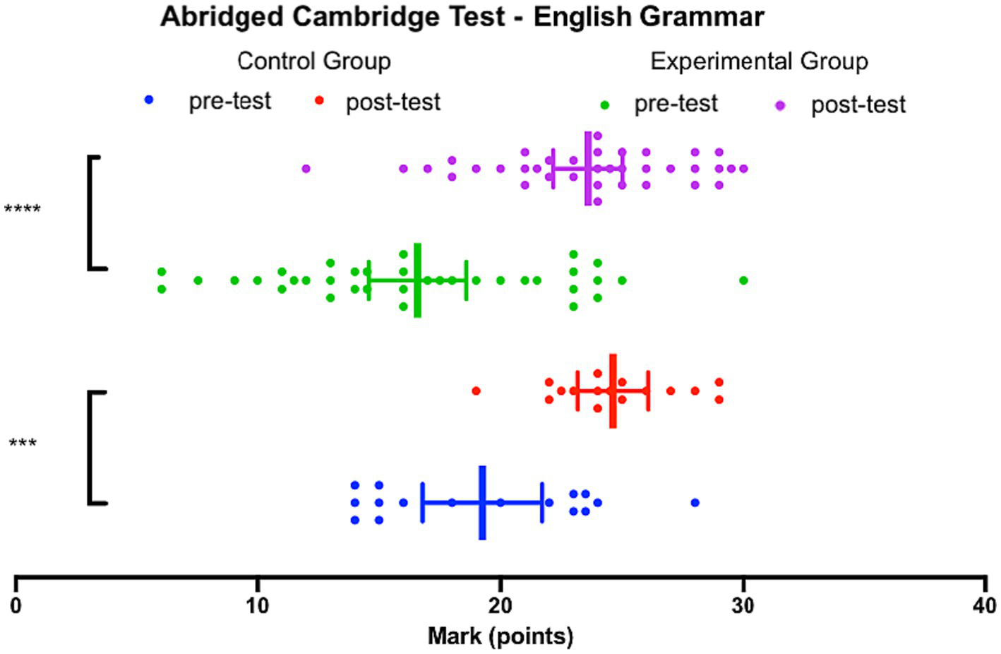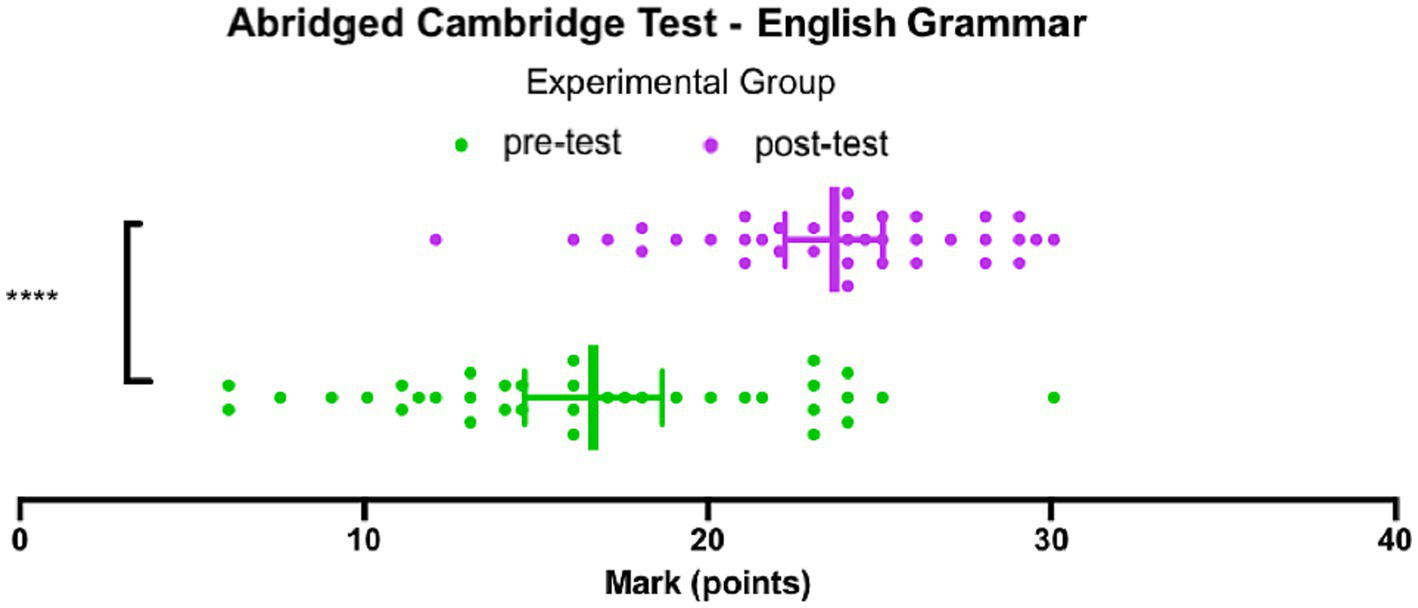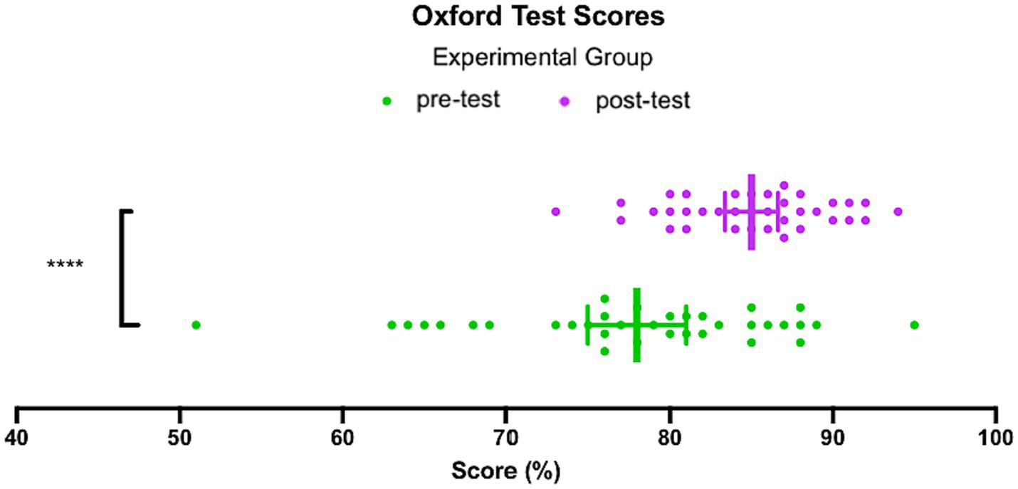 Considering that the data passed a normality test, a t-test comparison of the mean scores achieved on the pre-test and the post-test was conducted. As a group, the experimental group showed a significant improvement of 7.0 ± 1.7 (p < 0.0001, t = 4.154, df = 70). In other words, the intervention led to a statistically significant increase in the scores achieved by the experimental group.