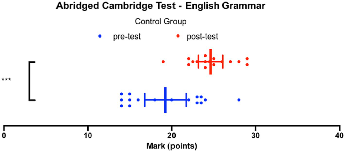 On the post-test, the median score is 14, and the interquartile range of 3.8 indicates that the middle 50% of the data falls between 11.0 and 14.8, which falls between the mid B2 and upper C2 levels on the official Cambridge English Qualifications scale. The lowest score achieved in the control group on the post-test was 8, while the highest score achieved was 15. The mean score of the participants in the control group on the post-test was 12.7 ± 0.6.