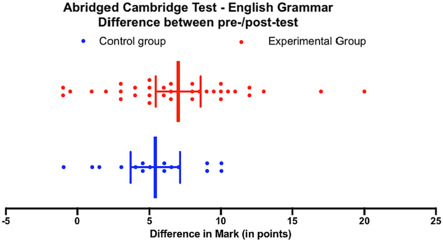 Abridged Cambridge Test – English Grammar, both groups, comparison of difference in scores between pre-test and post-test.