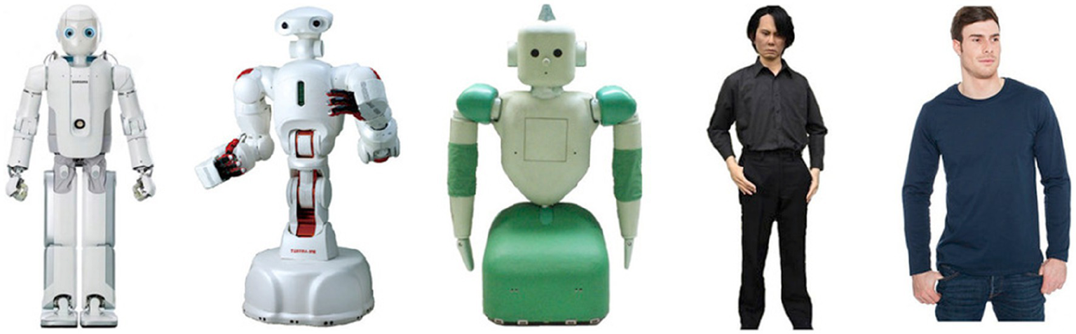 Pictures of the agents used in Study 1. From left to right: Robot 1, Robot 2, Robot 3, Robot 4, and Human.