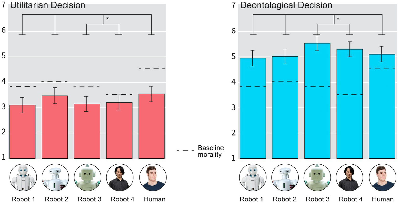 Interestingly, this contrasts slightly Laakasuo et al. (2021d), who used variations of the trolley dilemma and found that decisions of more human-like robots, whether deontological or utilitarian, were considered less moral. This discrepancy could be due to the Uncanny Valley effect’s reliance on photorealistic anchors, which are more prevalent in facial stimuli rather than full-body stimuli (Palomäki et al., 2018; Diel et al., 2021). However, there is another crucial difference between Malle et al. (2016) and Laakasuo et al. (2021d). Malle et al. (2016) used a low stakes moral dilemma (Switch version of the trolley dilemma), and Laakasuo et al. (2021d) used high conflict moral dilemmas (Footbridge version and its variations; see Laakasuo and Sundvall, 2016). Indeed, a recent study by Zhang et al. (2022) showed that there is a larger expectation for robots to be utilitarian in high-conflict moral dilemmas compared to impersonal dilemmas as used by Malle et al. (2015, 2016).