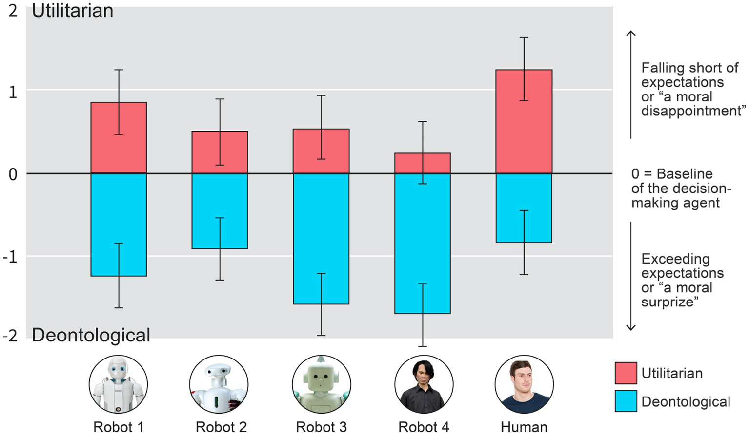 The results of the deviation score analysis seem to indicate that the two uncanny robots statistically significantly exceed their initial moral expectations more than the other agents when they decide not to act (deontological/omission decision): Valley-shaped contrasts for the deontological decision deviation score: (B = 2.60, 95% CI [1.33, 3.88], F(1, 614) = 16.09, p < 0.001).