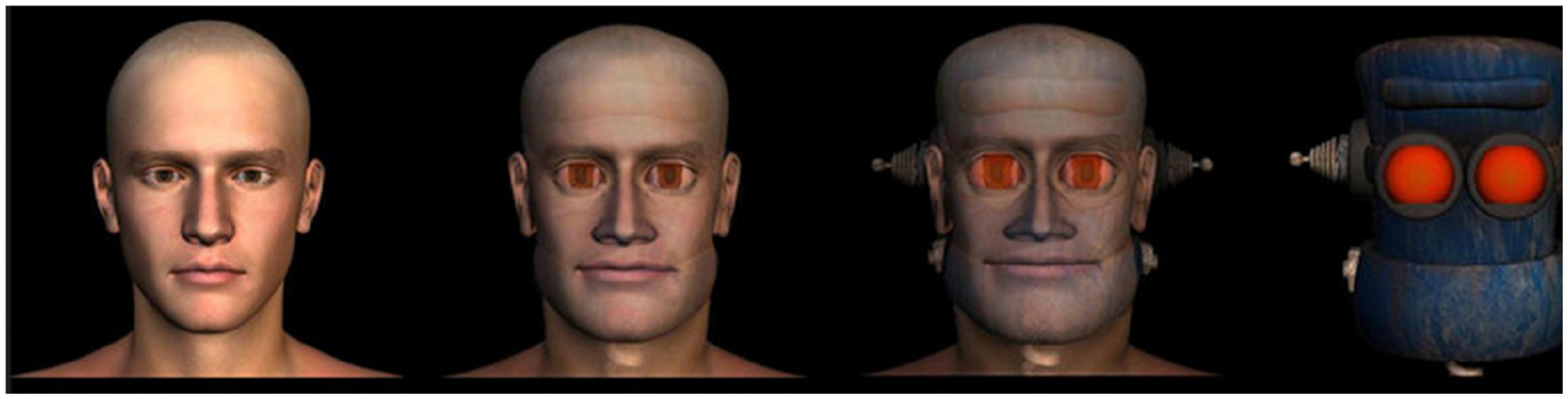 Four agents used in Study 2. From left to right: 1: CGI human; 2: Human-robot morph; 3: Robot-human morph; 4: Robot.