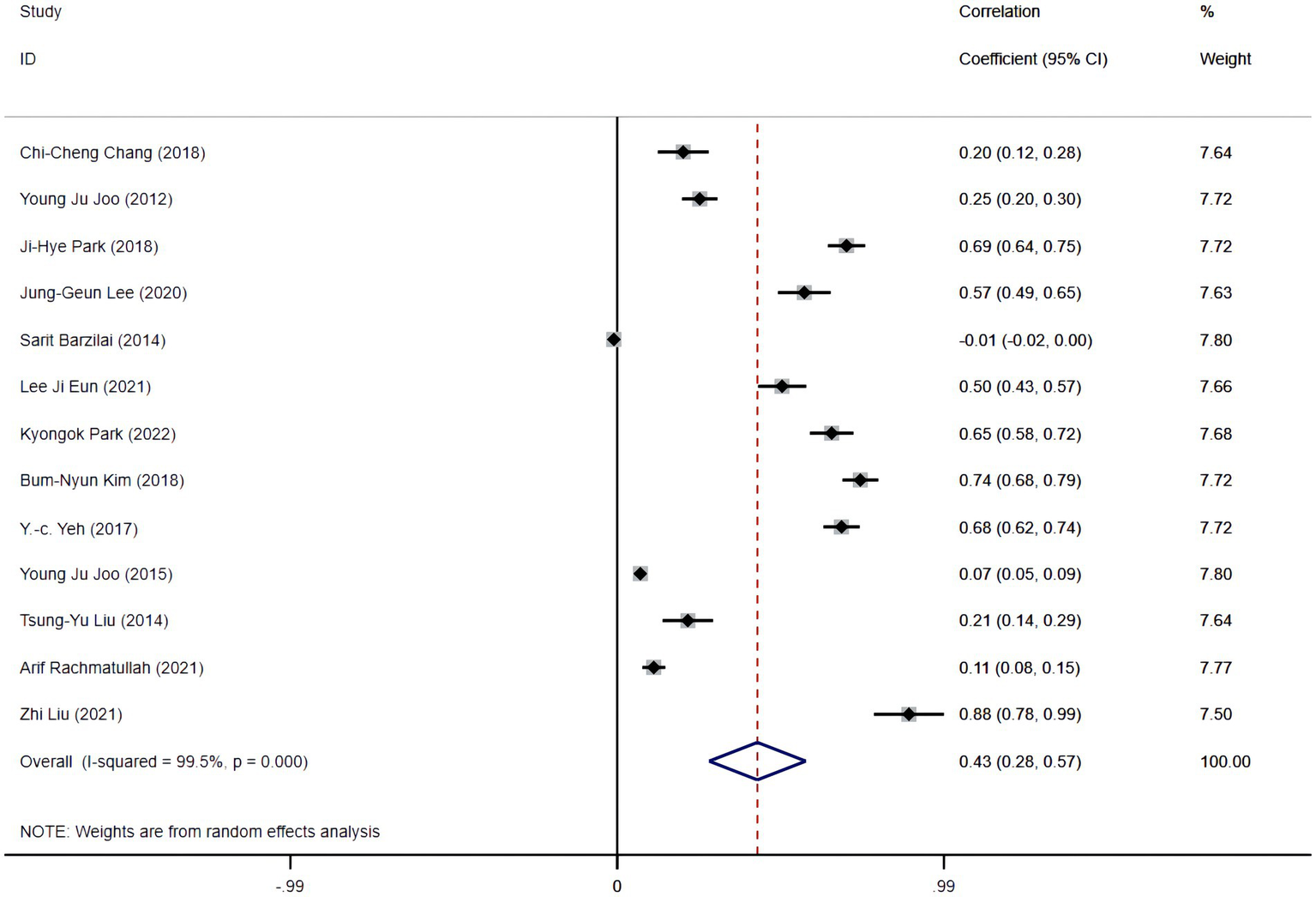 Thirteen RCTs were included, the total sample size used in the study was 3,253. Using the NOS evaluation tool of queue study, the average evaluation score of the included literatures was 7.46, indicating that the overall literature was above average. Besides, the data software StataSE was used to test the heterogeneity of the data, and the correlation coefficient and 95% confidence interval effect were found to be 0.43 (0.28, 0.57).