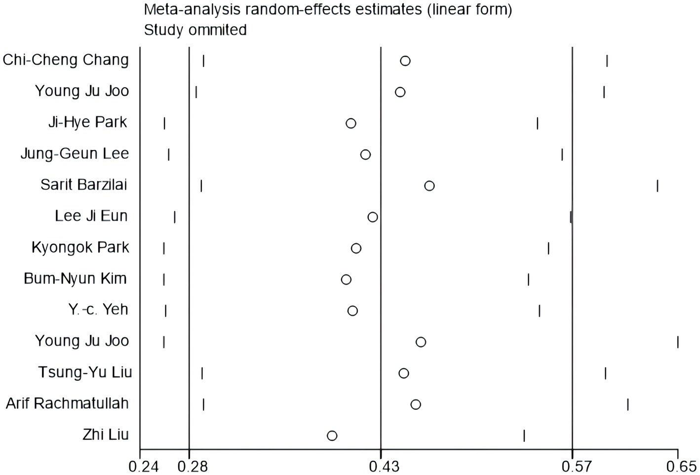To start with, based on the correlation coefficient and its 95% confidence interval, a publication bias test was performed, and a funnel chart was generated, which was considered roughly symmetrical on both sides, indicating no obvious publication bias. The details are shown in Figures 3, 4. We examined the potential publication bias of the correlation coefficient by analyzing its 95% confidence interval and subsequently constructing a funnel plot. The funnel plot illustrates that both the vertical and horizontal axes represent the standard error and effect sizes, respectively, with the confidence interval set at 95%. As points ascend within the plot, they indicate a reduction in standard error, with each circle depicting a separate study (Wijaya et al., 2022). We further scrutinized publication bias through Begg’s and Egger’s tests. Typically, when fewer than 20 studies are included, Egger’s test, with its superior efficiency, becomes more reliable than Begg’s, making Egger’s findings primarily considered. Subsequently, we conducted a meticulous sensitivity analysis, employing a sequential exclusion method (Harris et al., 2021). This approach entailed first removing the initial study and generating a forest plot to observe any consequent alterations in the results. We then reinstated the first paper, proceeded to exclude the second, and developed another forest plot. This process was repeated, sequentially excluding each subsequent study, to determine whether the absence of any specific paper would significantly skew the results. Ultimately, the consistency in outcomes under varying conditions confirmed the stability of our results. The details are shown in Figure 5.