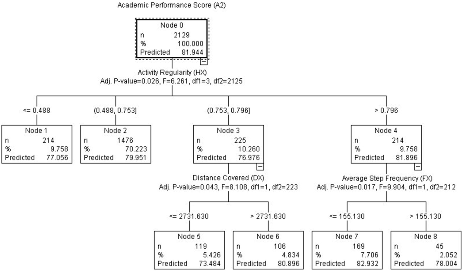 From Figure 2, it is evident that exercise regularity significantly influences academic performance (p < 0.00). In Node 2, 70% of students exhibited exercise regularity ranging from 0.488 to 0.753. These students, as long as they maintain good exercise regularity, can achieve satisfactory academic performance (AP = 79.951, comparable to the overall average of 79.553). Within the subset of students with higher exercise regularity, some individuals (Node 6) not only demonstrate regular exercise habits but also fulfill the designated running distance (Dx > 2731.63), resulting in above-average scores (AP = 80.896). The highest score is observed in Node 7, where students with the best exercise regularity (Hx > 0.796) and not necessarily fast running or high step frequency (FX > 155.13) achieve the best academic performance (AP = 78.0). It is the students who exhibit regular, slower-paced, and lower step frequency exercise patterns that excel in academic performance.