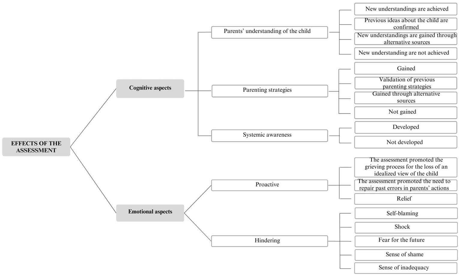 The main theme related to the effects of the assessment is well explored by the QUEVA-G scale although some subthemes are less considered. Assessment is particularly appreciated when it helps parents develop more accurate and empathetic narratives about their child, promote more functional family interactions, and foster a more systemic understanding of their child’s difficulties (Finn, 2007; Tharinger et al., 2009; Aschieri et al., 2013; Frackowiak et al., 2015). The items of the New Understanding of the Child and the Systemic Awareness subscales in QUEVA-G investigate these phenomena, referred to as “cognitive aspects.”