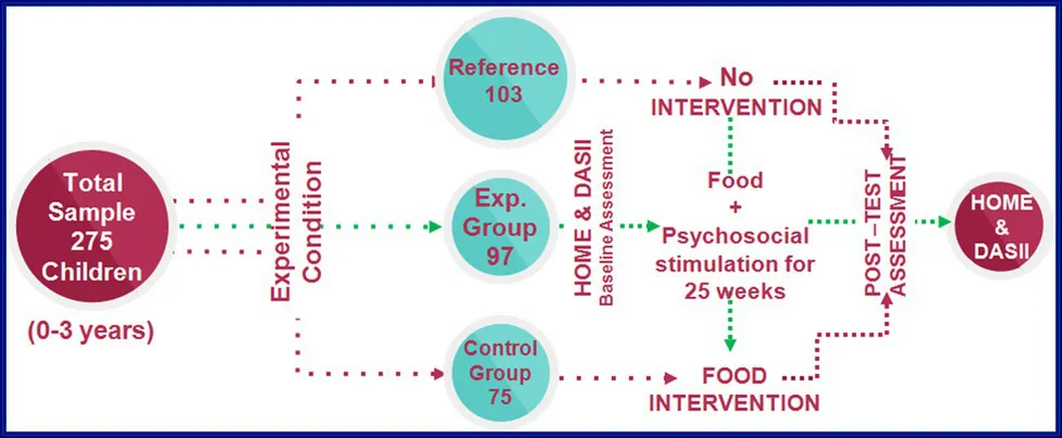 The 25-week intervention program comprised of both the experimental and control group children receiving food-based intervention. This included weekly take-home ration, food baskets, diet-plans and Timely targeted counseling (TTC) for the mothers. In addition to this, the experimental group received psychosocial stimulation-based intervention. This included intervention kit for each child comprising of play items, puzzles, art and craft workbook, colors etc. The research team and the NGO volunteer would visit the children in their respective homes every week and educate the mothers on the importance of play, touch, asking questions, reading and narrating stories, singing songs to the child, taking the child to travel and allowing the child to explore the nature. Such activities provide the malnourished child with the much-needed psychosocial stimulation to bridge the developmental delays. Both the groups were assessed for the motor and mental development again following the 25-week intervention program.