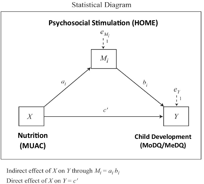 The primary variables under consideration were nutritional status (MUAC) and psychosocial stimulation (HOME) predicting the Motor development (MoDQ) and the mental development (MeDQ) of the preschool children. Preliminary analyses using SPSS (v22.0, IBM) tested the predictors and criterion variable for normality of distribution and outliers. The correlations between the variables under study, namely the nutritional status (MUAC), psychosocial stimulation (HOME), measures of child development (MoDQ and MeDQ), and the demographic variables were measured. It was followed by the simple mediation analysis, which was proposed by Baron and Kenny (1986). Here, we examined the association between the nutritional status of the child (MUAC) and the measures of child development (MoDQ and MeDQ) when psychosocial stimulation (HOME) intervened as the mediating variable. The parental education status, father’s occupation, family’s annual income, and residence were treated as covariates in the proposed model.