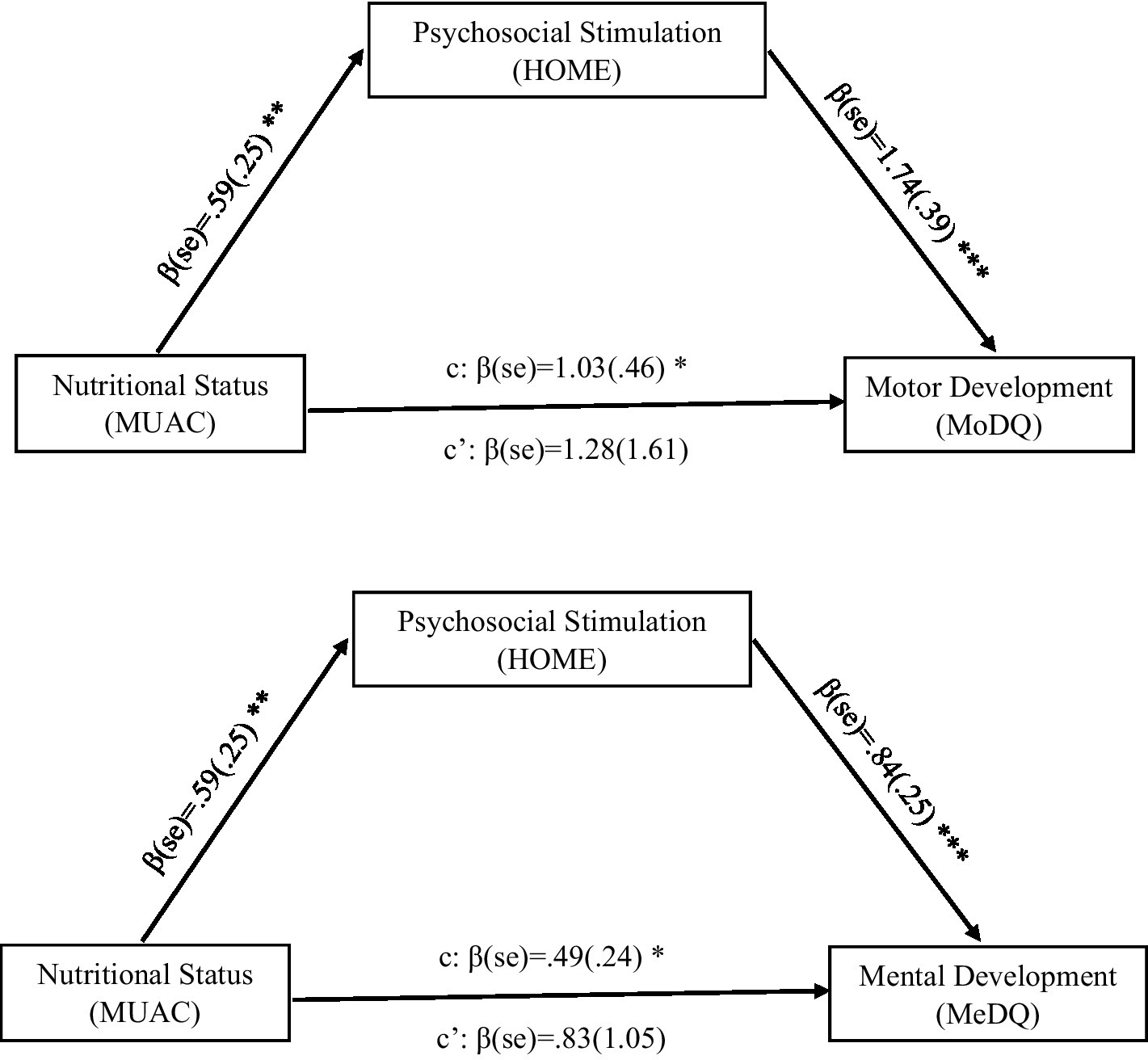 To test for the third hypothesis (H3), the combined regression paths between nutritional status, psychosocial stimulation, and the indices of a child’s motor and mental development were analyzed. Overall, the mediation model as depicted by the indirect path (c), significantly predicted the motor development [Effect = 1.03, 95% C.I. (0.19, 2.04)] as well as mental development [Effect = 0.49, 95% C.I. (0.09, 1.03)] in the children. Moreover, the direct path (c’) shows there was no longer a significant association between MUAC and MoDQ/MeDQ, after controlling for HOME. The results depict that child’s psychosocial stimulation perfectly mediates the association between nutritional status and child development (Tables 6–8).
