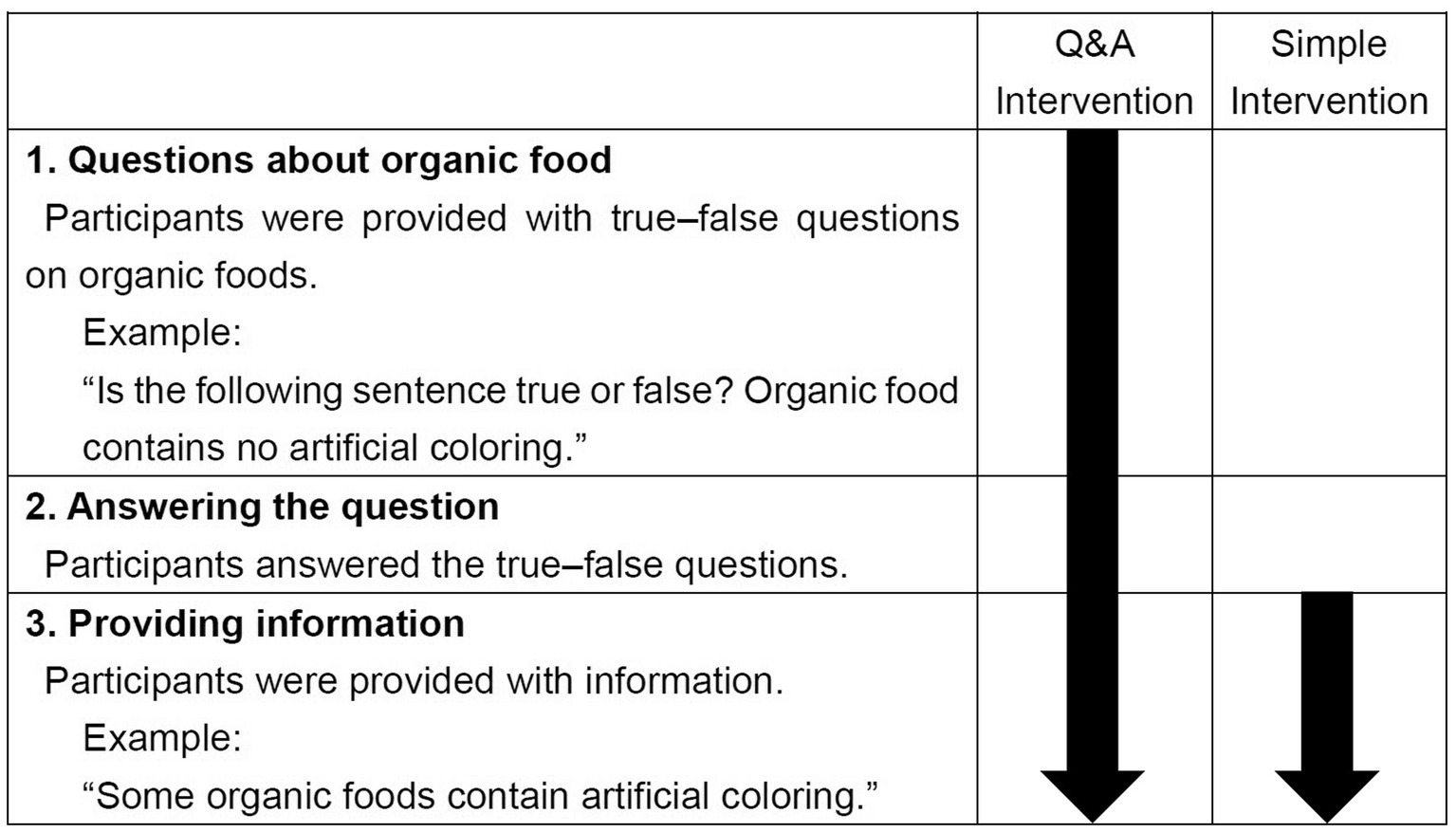 The process of Q&A intervention and simple intervention. Participants in Q&A intervention condition were provided with information after being asked to answer some questions and receiving feedback on whether their answers were correct. In this example, participants were informed: “Your answer was correct (incorrect). Some organic foods contain artificial coloring.”