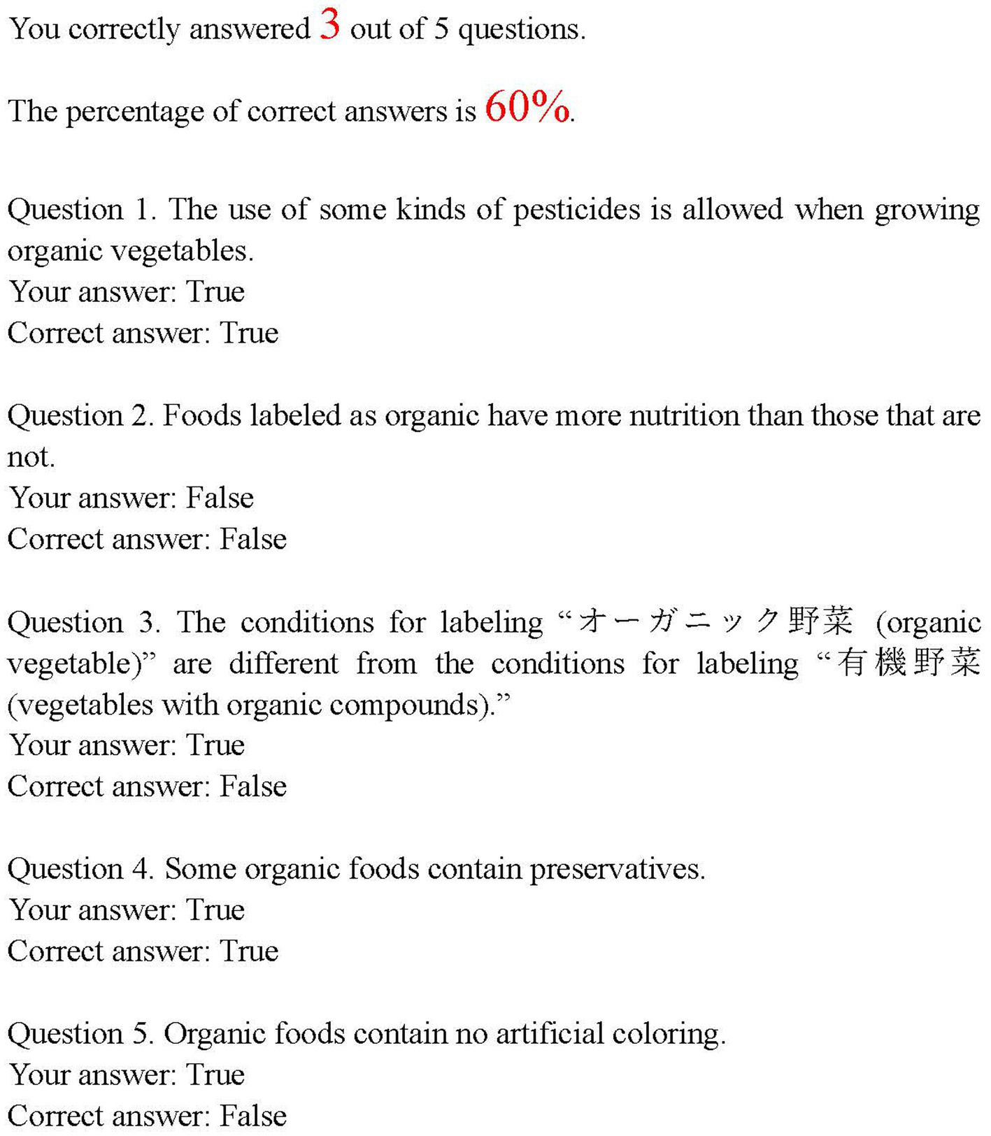 | 3 | The conditions for labeling “オーガニック野菜 (organic vegetable)” are different from the conditions for labeling “有機野菜 (vegetables with organic compounds).” | False | 29.66% |