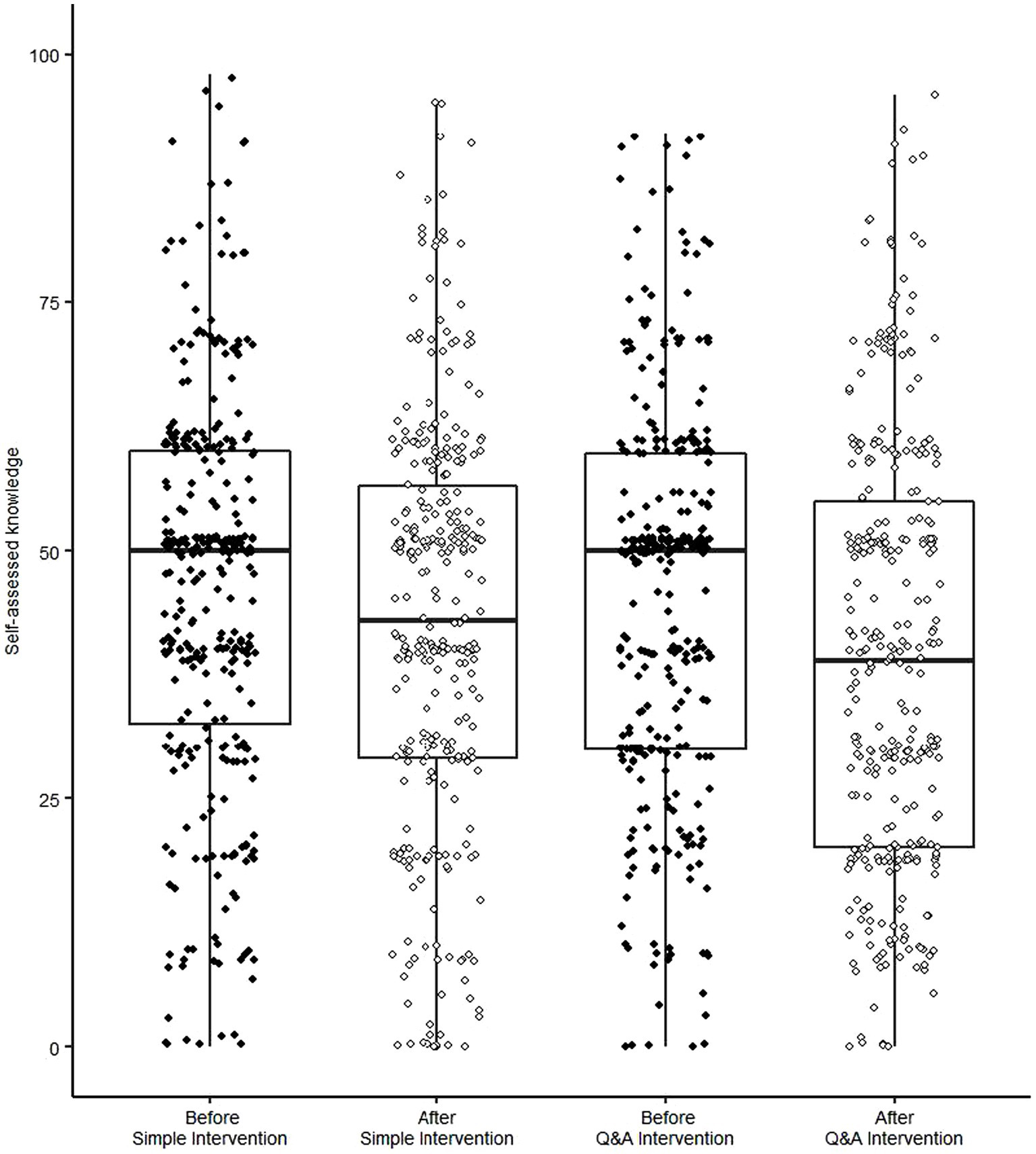 As shown in Figure 4, the main effect of measurement timing was statistically significant [F (1, 651) = 36.46, p < 0.001, η2p = 0.05], indicating that participants’ self-assessed knowledge after the intervention was lower than that before it. This effect size was larger than 0.04, the “recommended minimum effect size representing a ‘practically’ significant effect for social science data” (Ferguson, 2009). The interaction effect between the intervention and measurement timing was not significant [F(1, 651) = 1.91, p = 0.17, η2p = 0.00]. These results implied that Simple Intervention, as well as Q&A Intervention, on average, reduced participants’ self-assessed knowledge. Indeed, regardless of the intervention style, self-assessed knowledge after intervention (M = 42.06, SD = 21.63 for Q&A Intervention, M = 39.26, SD = 22.16 for Simple Intervention) was lower than that before the intervention (M = 45.46, SD = 20.12 for Q&A Intervention; M = 44.68, SD = 20.21 for Simple Intervention). The main effect of the intervention method [F (1, 651) = 1.47, p = 0.23, η2p = 0.00] was not significant.