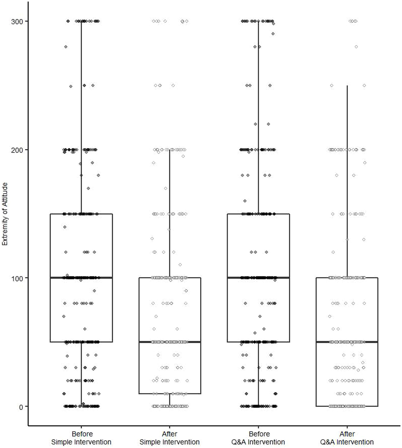 H2: The difference (reduction) in attitude extremity between before and after the Q&A Intervention is greater than the difference in attitude extremity between before and after the Simple Intervention.