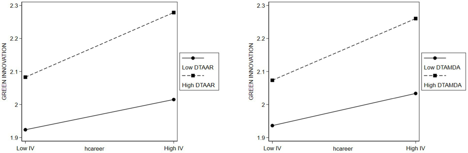 Several mechanisms can explain the negative moderating effect of corporate digital transformation on the relationship between TMT career experience heterogeneity and green innovation. First, companies may become too reliant on data, which could suffocate creativity and intuition, vital components of innovation (Bolton et al., 2015). This could be particularly pronounced in diverse management teams, where data might be used to suppress differing opinions rather than fostering innovative ideas (Shen, 2017). Second, rich resources can lead to misallocation or misuse (Huang and Meng, 2023). In the context of digital transformation, this could entail overinvestment in certain technologies at the expense of others such as green technologies (Aral and Weill, 2007; Ross et al., 2017). Third, the abundance of resources might breed complacency, leading companies to believe that they have everything they need to succeed (Tripsas and Gavetti, 2000; Christensen et al., 2016). This can generate resistance to change and innovation, especially in diverse teams, where change can be more challenging to implement (Bower and Christensen, 1995; Eggers and Kaplan, 2013). From the resource curse perspective, we propose the following hypothesis: