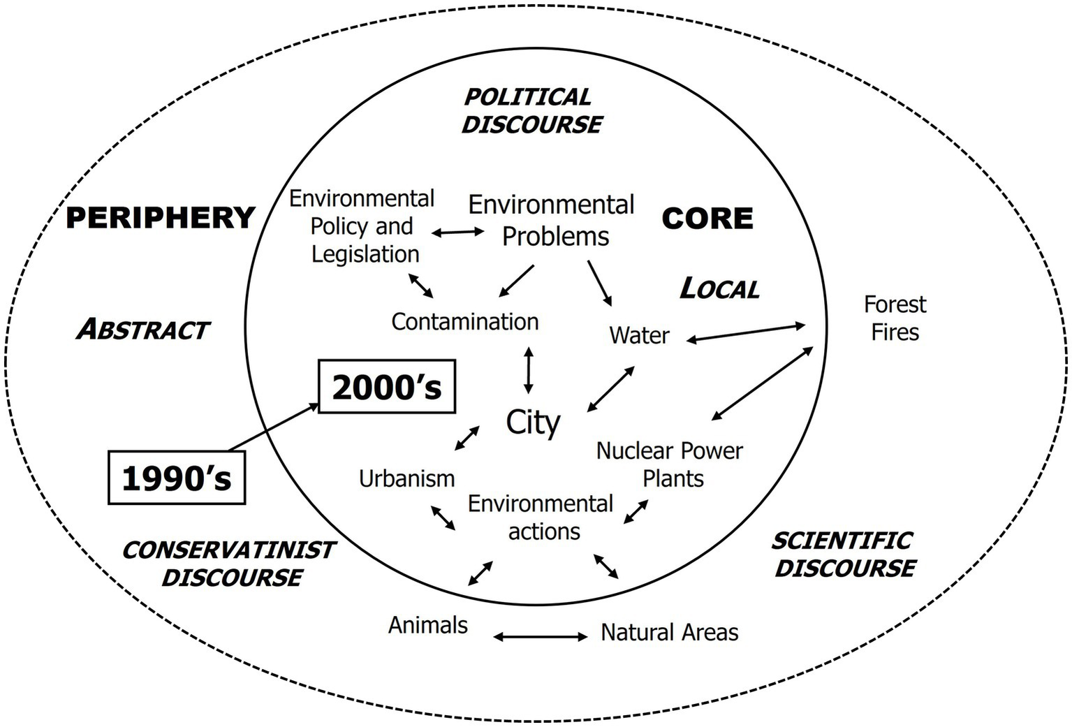 The Figure 1 illustrates the changes in the social representation of the environment between 1992 and 2006 in the Barcelona press. Thematic categories that are closely associated with each other are clustered together on the map, with some occupying the central position and others located on the periphery of social representation. Three distinct types of discourse can be clearly identified: conservationist, scientific, and political. The evolution of environmental discourse is evident in the transition from conservationist to scientific and ultimately to political discourse, highlighting the increasing politicization of environmental issues during this period.