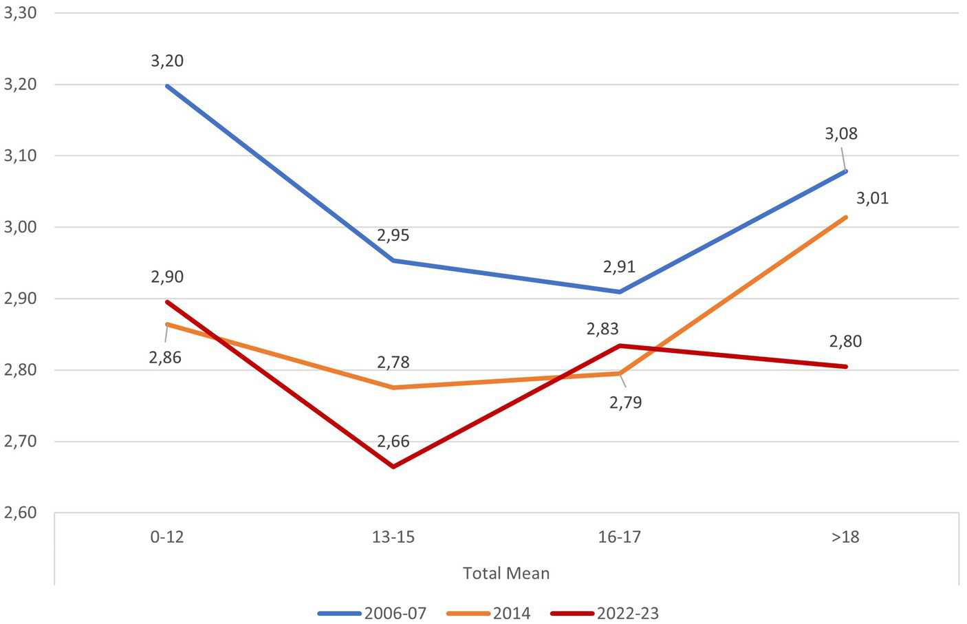 Comparison of scores 2007–2014–2023 by age. The graph represents the results of each of the three applications, showing the scores by age range.