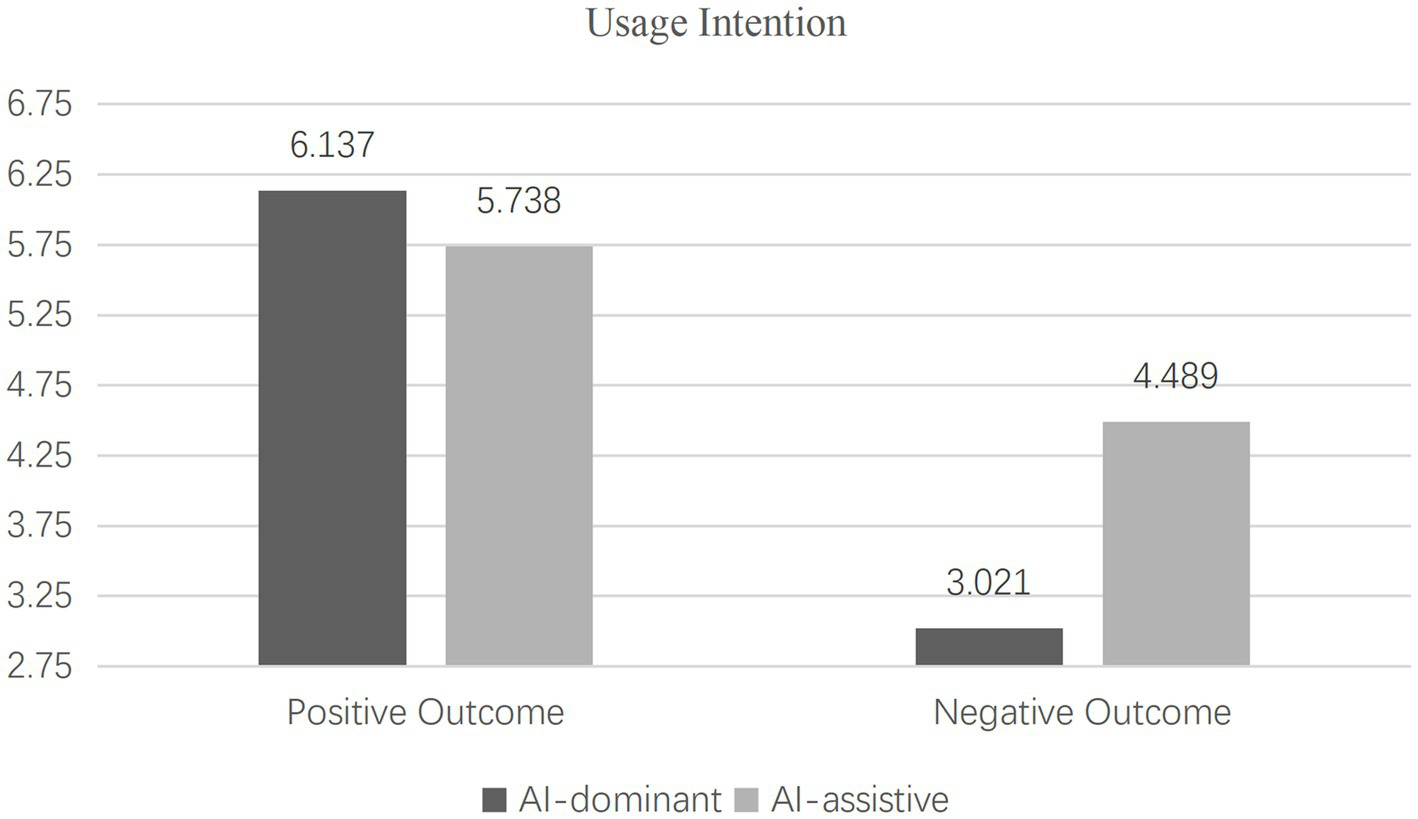 Conversely, under negative outcome expectancy, the AI-dominant group demonstrated lower evaluations [MAI-dominant = 3.014, SD = 1.483 vs. MAI-assistive = 4.428, SD = 1.429; F(1, 172) = 25.301, p < 0.001] and usage intentions [MAI-dominant = 3.021, SD = 1.609 vs. MAI-assistive = 4.489, SD = 1.514; F(1, 172) = 19.918, p < 0.001] compared to the AI-assistive group, validating Hypothesis 1b. The specific results are dissected in Figures 2, 3.