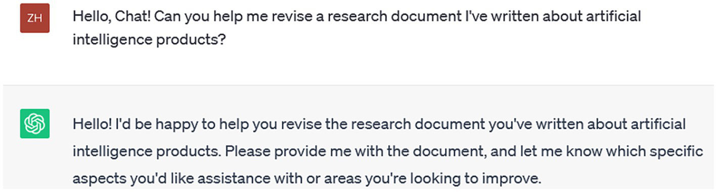 According to the different collaboration types, participants were randomly assigned to two groups: AI-dominant group and AI-assisted group, and were presented with distinct experimental contexts. Group AI-D participants were presented with Figure 4, while Group AI-A participants were shown in Figure 5. In the AI-dominant group, participants were asked to imagine using ChatGPT to directly generate a piece of written content as needed. Conversely, in the AI-assisted group, participants were asked to imagine using ChatGPT to revise and refine their already completed written materials.
