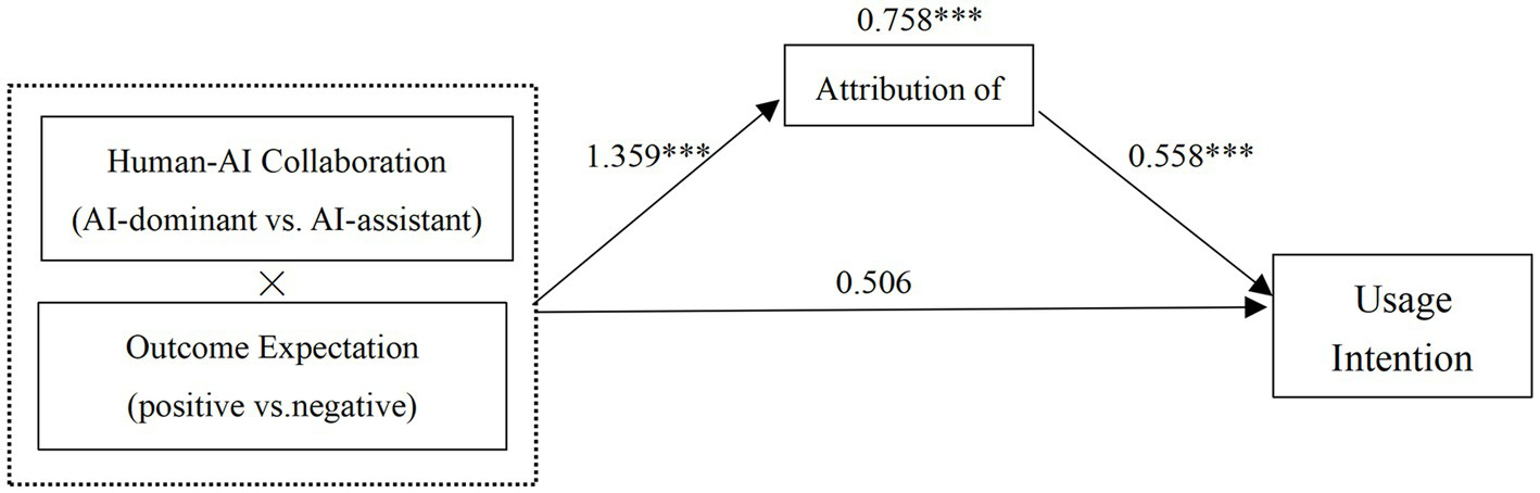 Mediation Analysis: Using Model 8 in the PROCESS program with 5,000 bootstrap samples and a 95% confidence interval, mediation effects of responsibility attribution were tested as mediators for consumer evaluation and usage intention (Hayes, 2013, 335–337). The results, as presented in Table 1, demonstrated that responsibility attribution played a mediating role in the interaction effects of human-AI collaboration type and outcome expectation on consumer evaluation (LLCI = 0.217, ULCI = 1.004, not including 0) and usage intention (LLCI = 0.332, ULCI = 1.211, not including 0), with mediation effects of 0.590 and 0.758, respectively. This confirms Hypothesis H2, as depicted in Figures 6, 7. Further analysis revealed that under negative outcome expectation, the mediation effect of responsibility attribution on consumer evaluation (LLCI = −0.705, ULCI = −0.147, not including 0) and usage intention (LLCI = −0.865, ULCI = −0.221, not including 0) was significant. Similarly, under positive outcome expectation, the mediation effect of responsibility attribution on consumer evaluation (LLCI = 0.056, ULCI = 0.244, not including 0) and usage intention (LLCI = 0.080, ULCI = 0.415, not including 0) was also significant. In summary, responsibility attribution serves as a mediator in the process of the interaction effects of human-AI collaboration type and outcome expectation on consumer evaluation and usage intention, confirming Hypothesis H2.