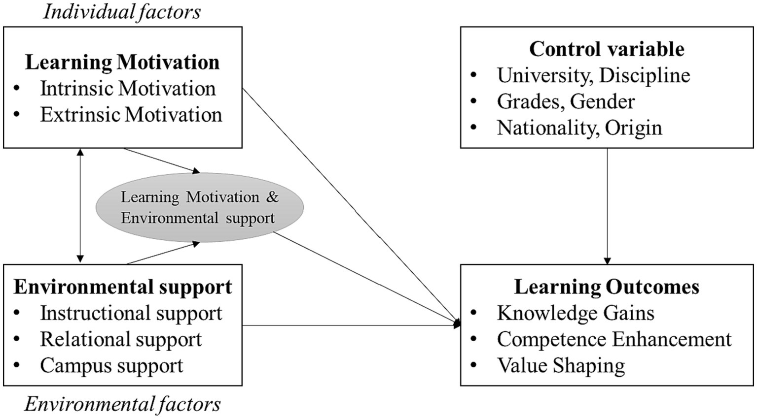 Therefore, from a comprehensive perspective, the academic success of first-generation college students depends on whether their subjective agency and learning motivation are stimulated and whether sufficient environmental support is provided. In fact, existing literature has suggested integrating both individual and environmental factors that influence the academic development of first-generation college students, particularly the role of postnatal individual and environmental factors. Focusing on first-generation college students in China, this study examines the integrated influence of individual and environmental factors on their academic outcomes. Figure 1 illustrates the conceptual model of this study. By drawing upon the theoretical framework and existing literature, this study primarily discusses the impact of individual factors (learning motivation) and environmental factors (environmental support) on students’ learning outcomes, resulting in research hypotheses H1 and H2. It’s worth noting that individual and environmental factors interact with each other, influencing students’ learning outcomes. Consequently, the interaction between these two factors is discussed, leading to research hypothesis H3.