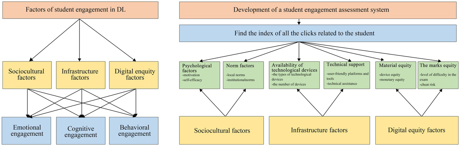 Although many studies have identified the underlying factors of student engagement in DL from their different analytical angles and perspectives, they have primarily focused on specific and detailed factors. These existing studies lack a comprehensive and systematical exploration of the underlying factors related to student engagement, especially in-depth exploration of poor engagement factors (Gan et al., 2007; Huang et al., 2012; Demouy et al., 2016; Lee et al., 2019). Furthermore, while some studies have proposed strategies for DL in primary education (Vanderlinde et al., 2010; Edisherashvili et al., 2022), they have paid little attention to higher education and the utilization of algorithm systems for automated assessment. Even for some researchers applying machine learning to investigate student engagement, they only focuses on single-dimension index, like activity logs, student attendance, behavioral data, etc. (Orji and Vassileva, 2020). These gaps are what prompted this study to explore the implementation of DL in higher education. Specifically, this research aims to achieve three goals: (1) To explore the factors that influence student engagement in DL from the perspectives of students; (2) To develop a model for student engagement in different course activities through the utilization of machine learning algorithms; (3) To promote sustainability science in DL.