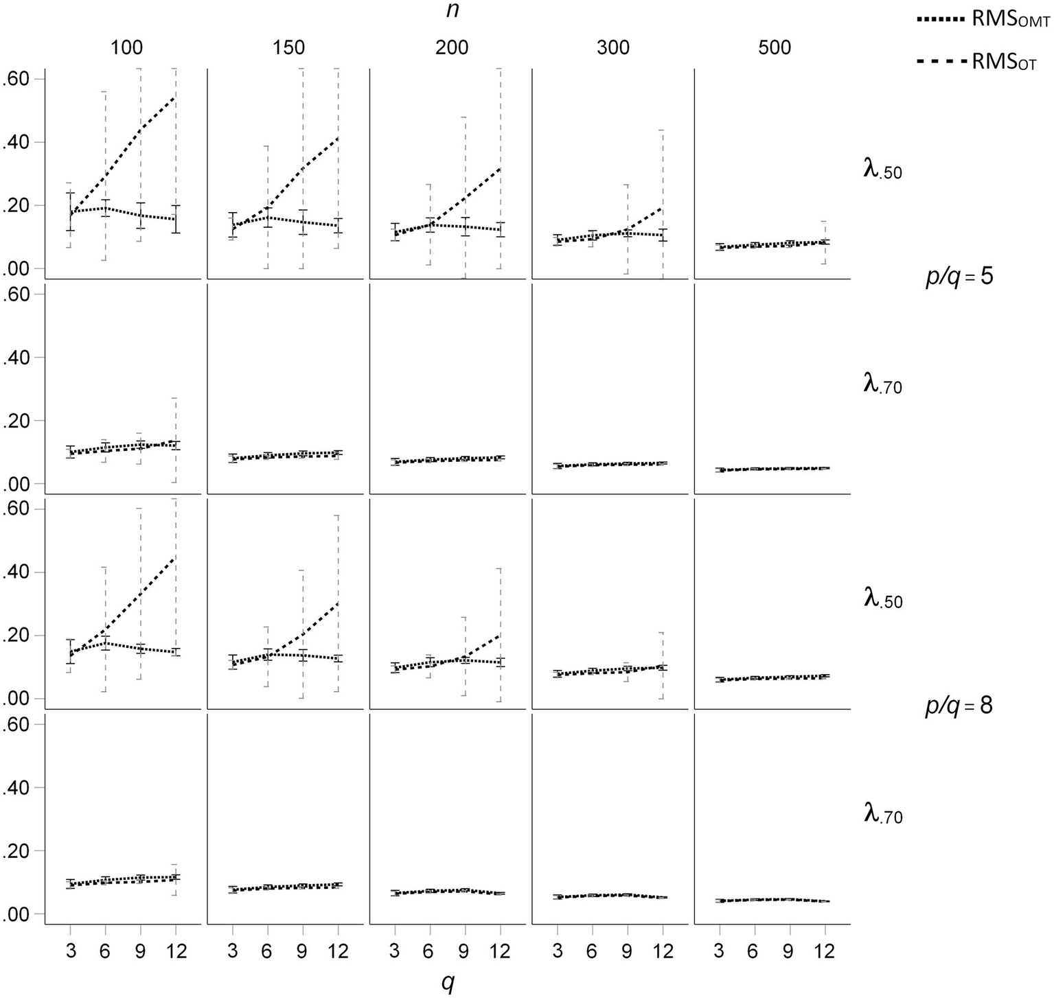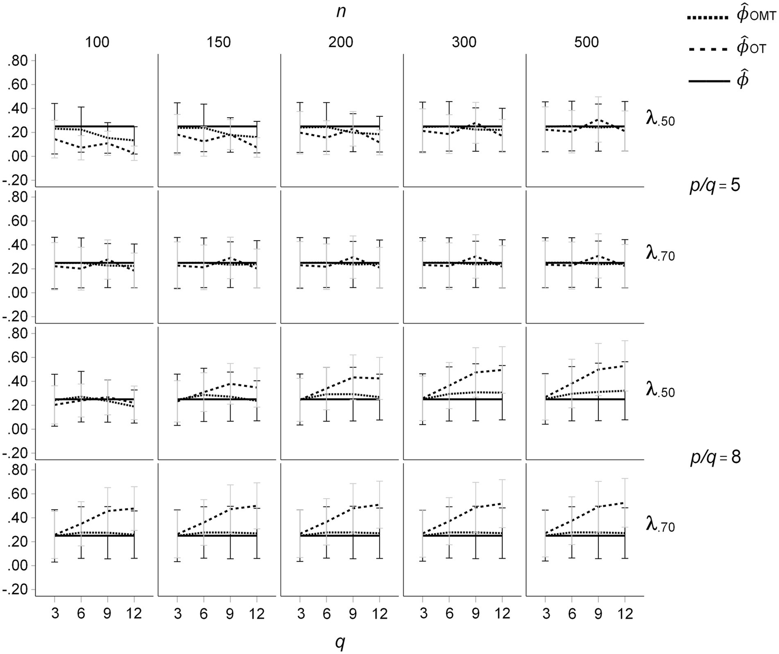 The dependent variables were the OT- and OMT-factor inter-correlations and their bias which was computed as the difference between the OT/OMT-factor inter-correlations and the corresponding population factor inter-correlations (ϕ). Moreover, the root mean square (RMS) difference of the OT- and OMT-rotated factor pattern with the population loading pattern as well as the recovery of factor scores, i.e., factor score indeterminacy (Grice, 2001), the correlation of the regression factor scores calculated from the OT/OMT-rotated factors with the true factors, was computed.
