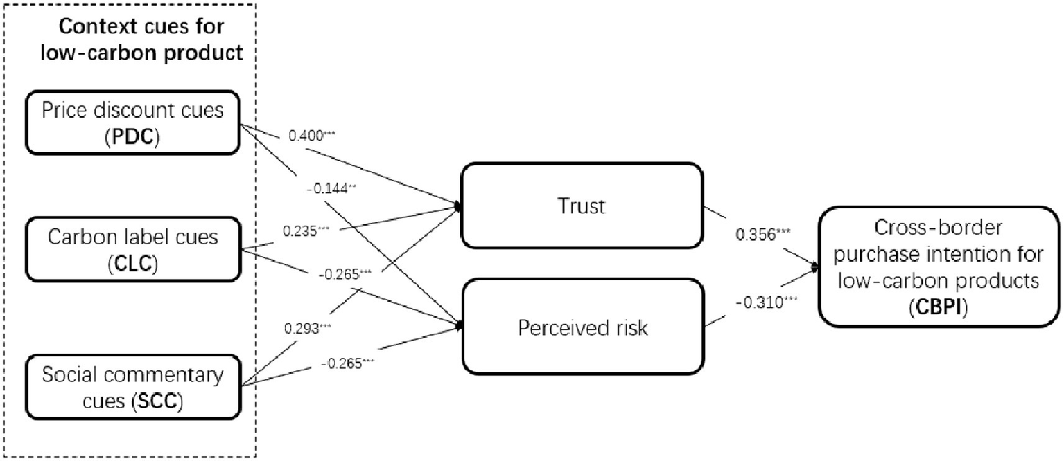 Results: We found that all three context cues have significant positive effects on trust and negative effects on perceived risk. College students’ trust positively and perceived risk negatively impact college students’ CBPI for low-carbon products. In addition, based on different cultures, languages, and education, this study investigates the moderating effect of college students’ nationality on their significantly different cue processing modes for low-carbon products.