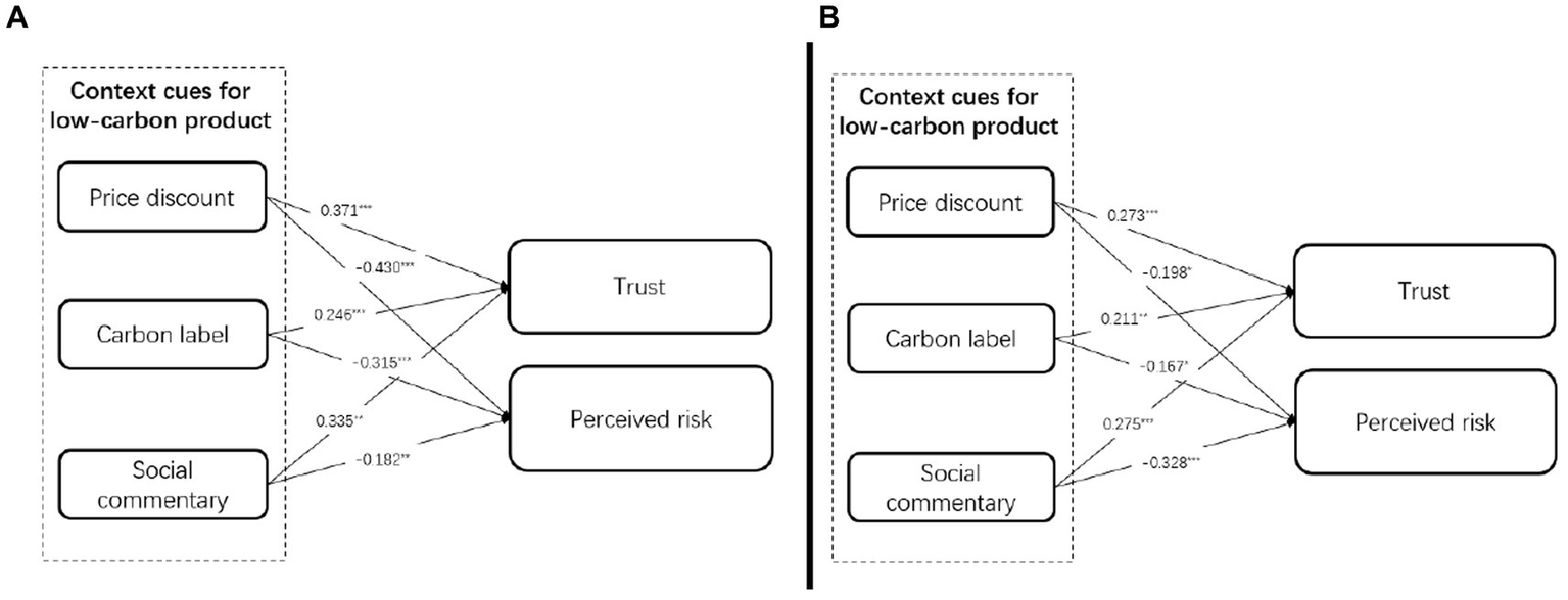 Furthermore, as our experimental findings reveal that, in the South Korean (vs. Chinese) college student group, all three context cues for low-carbon products have a significant stronger impact on trust; moreover, price discount and carbon label cues have stronger effects on perceived risk as assumed. Thus, H6 is partially supported. Some previous studies have investigated various psychological and behavioral differences between South Korea and China in general online/offline consumption process (Chu et al., 2019; Fan et al., 2022; Wang et al., 2022). Nationality and cultural differences are rarely addressed in investigating consumers’ low-carbon consumption behavior (Wang et al., 2023). While, as we investigate in this study, due to different cultural educations, economy policies, and political environment, South Korean and Chinese college students have shown predictable differences in low-carbon consumption processing in a CBEC setting; therefore, it is particularly important to study the differences in low-carbon consumption characteristics through the lens of regional and cultural differences (Shavitt and Barnes, 2020; Fan et al., 2022).